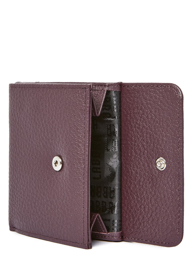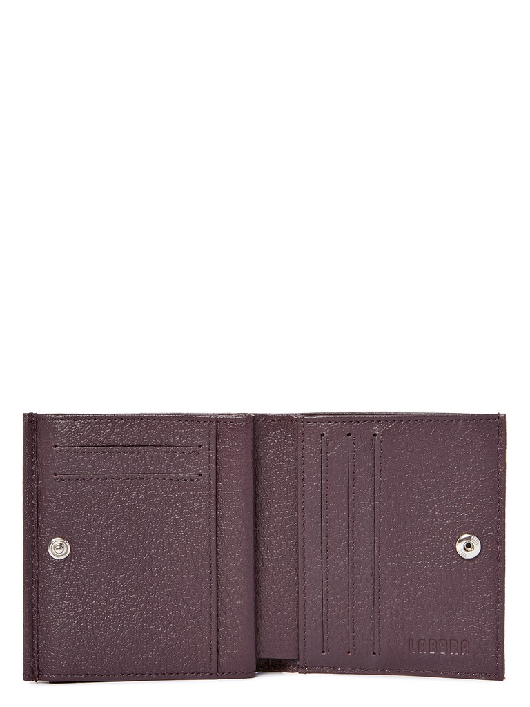 Женский кошелёк торговой марки LABBRA из нейлона. Основное отделение закрывается на кнопку. Внутри: два складывающихся отделения для купюр, одно из которых закрывается на дополнительную пластиковую молнию; пять карманов для карточек и два дополнительных плоских кармана. Снаружи кошелька имеется отделение для мелочи, которое закрывается клапаном с кнопкой.