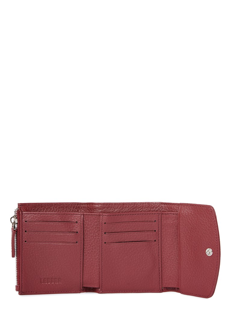 Женский кошелёк торговой марки LABBRA из натуральной кожи. В кошельке есть одно складывающееся отделения для купюр и 9 различных карманов для кредитных и дисконтных карт, эти отделения закрываются клапаном с кнопкой. Отделение для мелочи расположено под клапаном и закрывается на молнию. Дополнительное отделение расположено снаружи и закрывается на молнию.