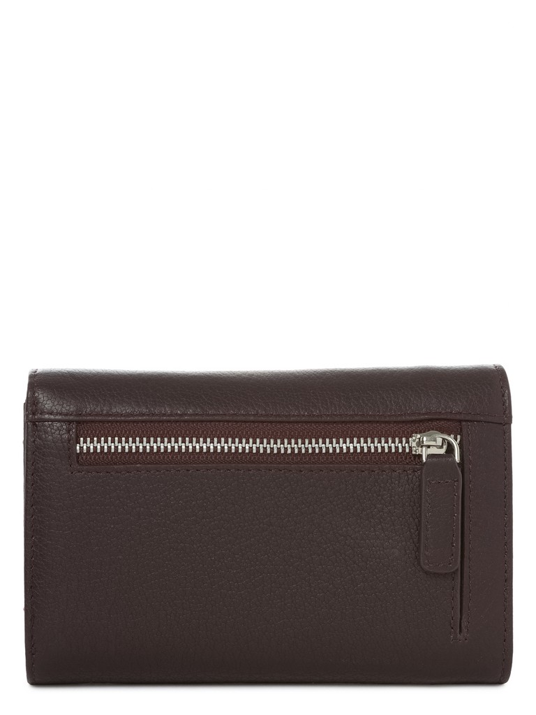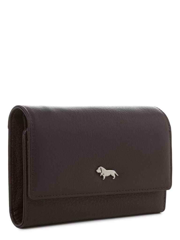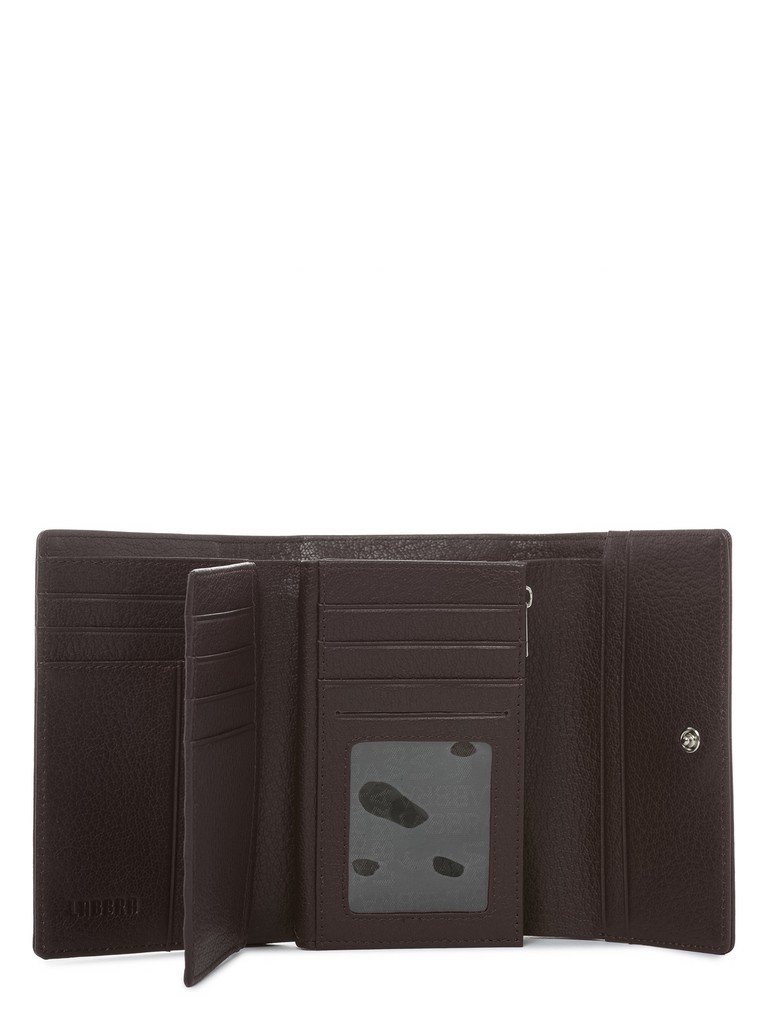 Женский кошелёк торговой марки LABBRA из натуральной кожи. Модель закрывается клапаном на кнопку. В кошельке есть 2 складывающееся отделения для купюр, одно из которых закрывается на пластиковую молнию, 17 карманов для кредитных и дисконтных карт, 6 дополнительных различных плоских открытых кармана, 2 кармана для мелочи - внутри и снаружи, оба закрываются на молнию и имеют по одному отделению.