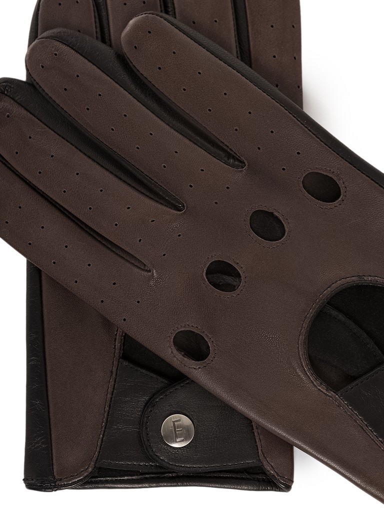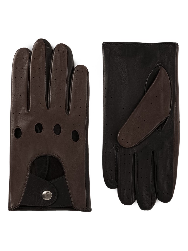 Автомобильные мужские перчатки торговой марки ELEGANZZA. Выполнены из эксклюзивной итальянской кожи ягнёнка без подкладки. На лицевой стороне декорированы перфорацией, ремешком на кнопке и вырезами. Модель со средней длиной пальцев и длиной манжеты от нижней точки большого пальца до края перчаток - 3 см.