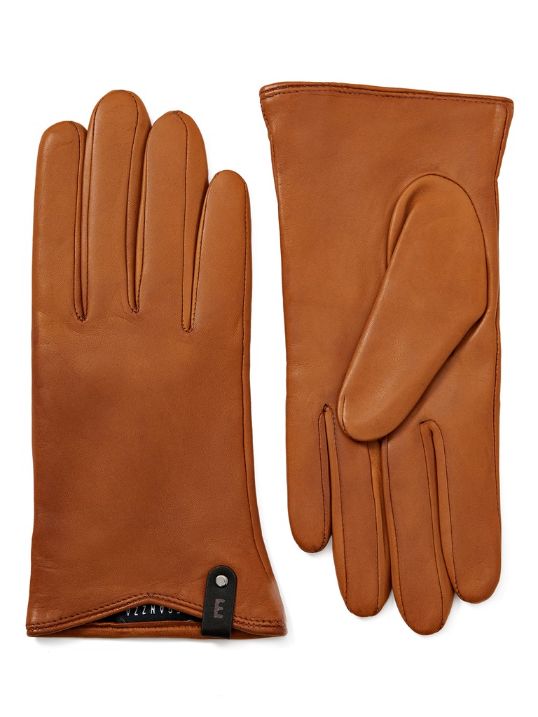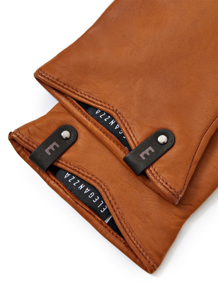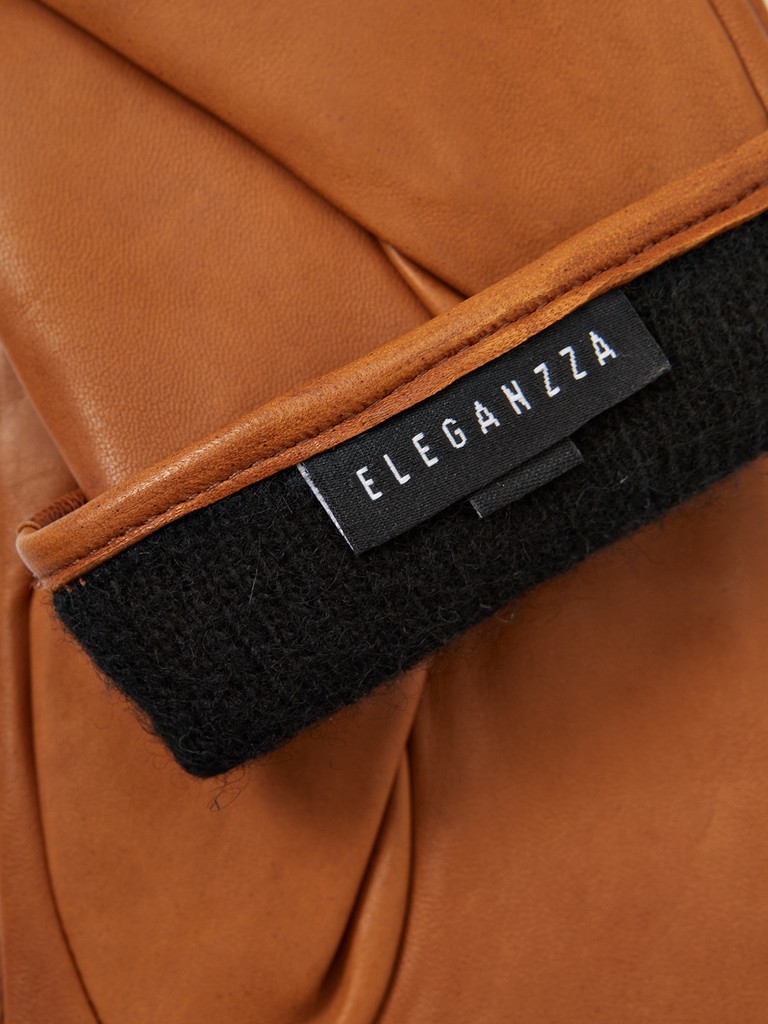 Перчатки женские торговой марки ELEGANZZA. Выполнены из эксклюзивной итальянской кожи ягнёнка и дополнены подкладом из шерстяной пряжи с добавлением кашемира. Украшены кожаной петелькой, декорированной вышивкой с фирменным логотипом и металлическим хольнитеном. Модель со средней длиной пальцев и длиной манжеты от нижней точки большого пальца до края перчаток - 3 см.