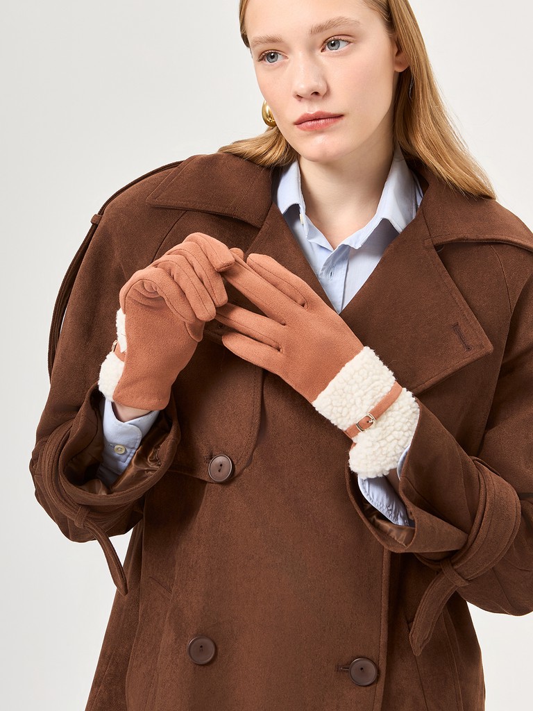 Перчатки женские торговой марки LABBRA в трендовом цвете сезона. Выполнены из трикотажа и дополнены мягким флисовым подкладом. Манжеты декорированы эффектной отделкой из меха и украшены тонким ремешком с металлической пряжкой. Модель со средней длиной пальцев и длиной манжеты от нижней точки большого пальца до края перчаток - 2 см.