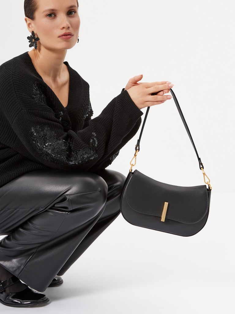 Женская сумка торговой марки Eleganzza из натуральной кожи. Хит сезона - элегантный багет с универсальной стилизацией. Плавные линии, сдержанный дизайн, удобная организация внутреннего пространства. Модель закрывается клапаном и фиксируется матовой лаконичной фурнитурой. Внутри одно отделение с карманом на молнии и открытым карманом. На задней стенке есть открытый карман. Высота ручки - 29 см. Модель не имеет ножки на дне. Не вмещает формат А4.