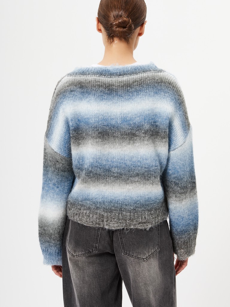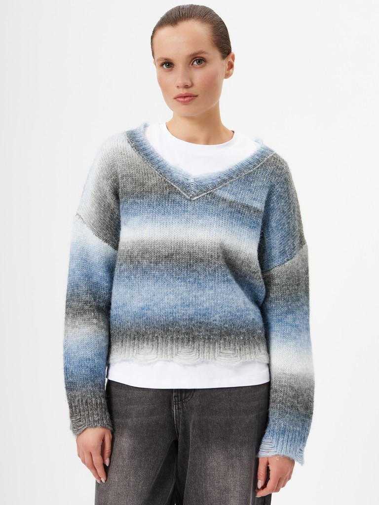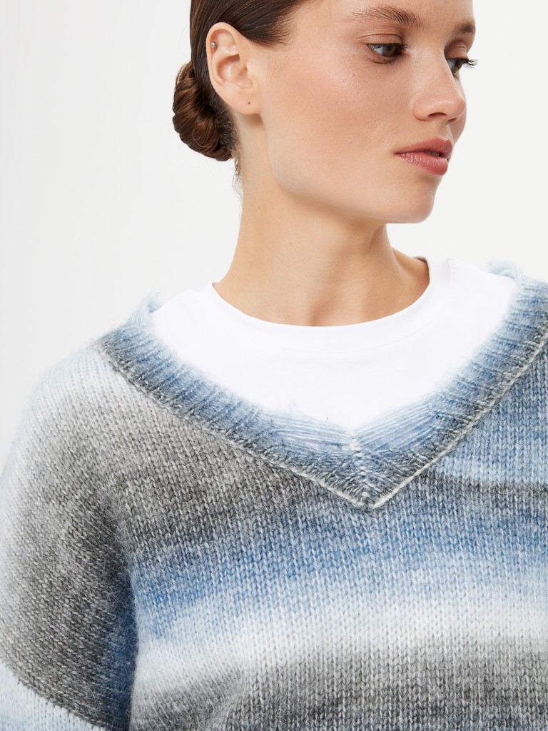 Женский вязаный джемпер свободного прямого силуэта. Длина выше бедра, У-образный вырез горловины. Длинные рукава. Элегантный декор: роспуск по низу изделия и манжетам.
