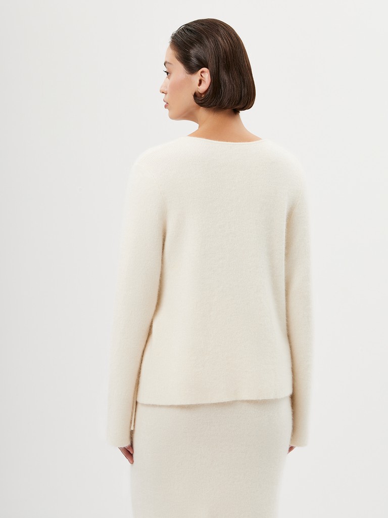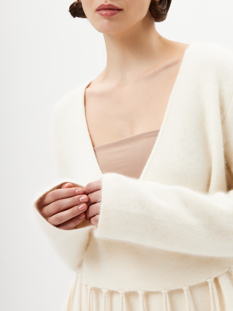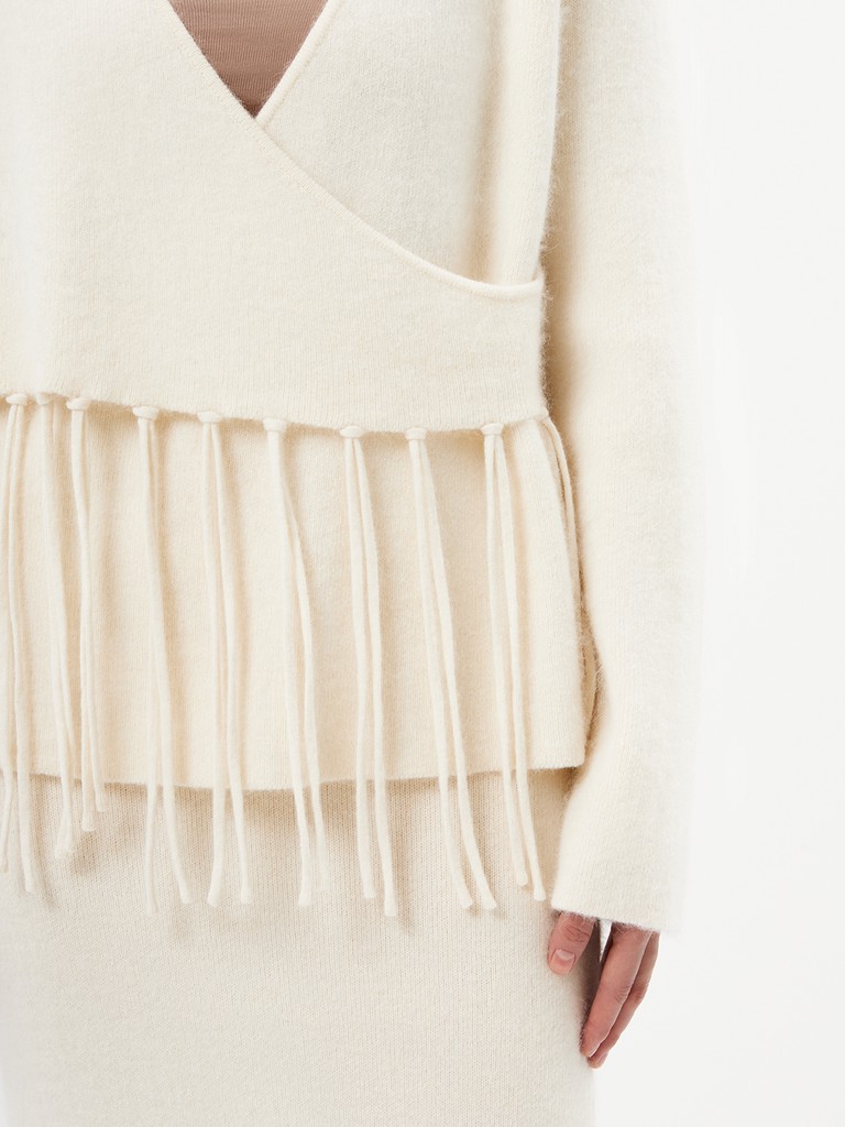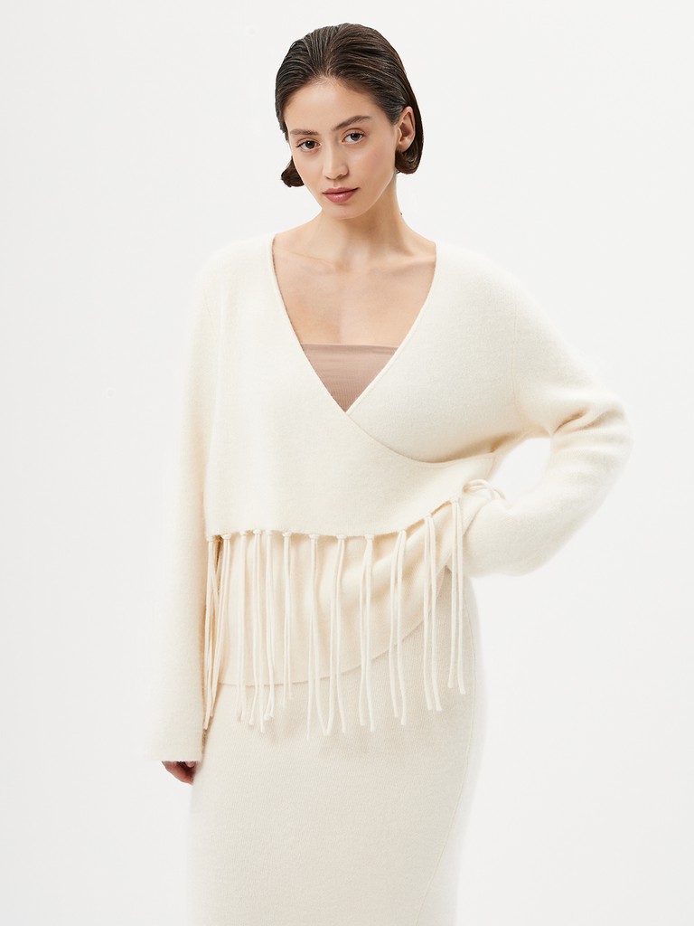Женский вязаный джемпер полуприлегающего силуэта— модель нежно-молочного цвета с запахом и отделкой декоративной бахромой, спускающейся от талии. Узкие длинные рукава подчеркивают силуэт, а свободный крой добавляет образу легкости и динамики.