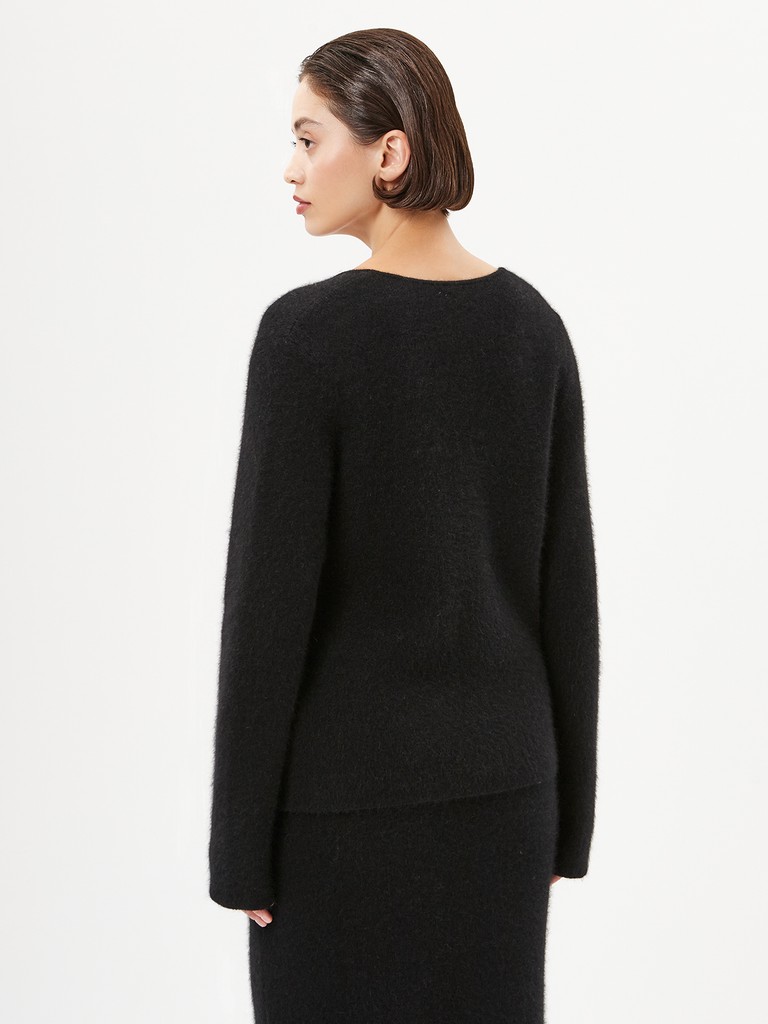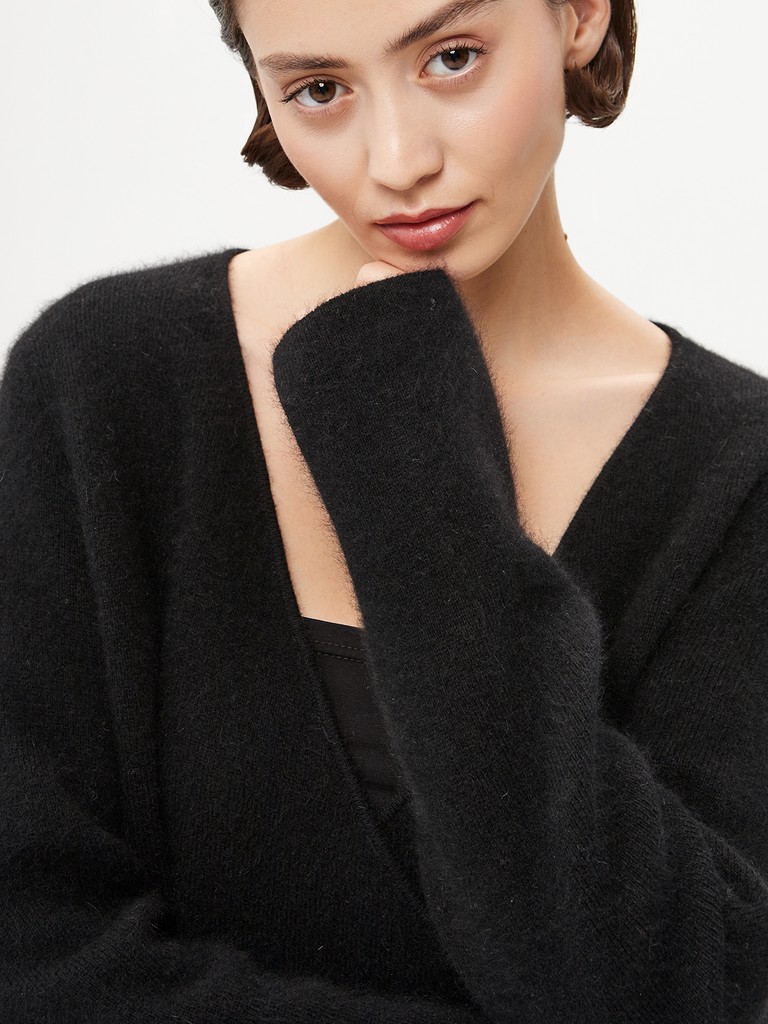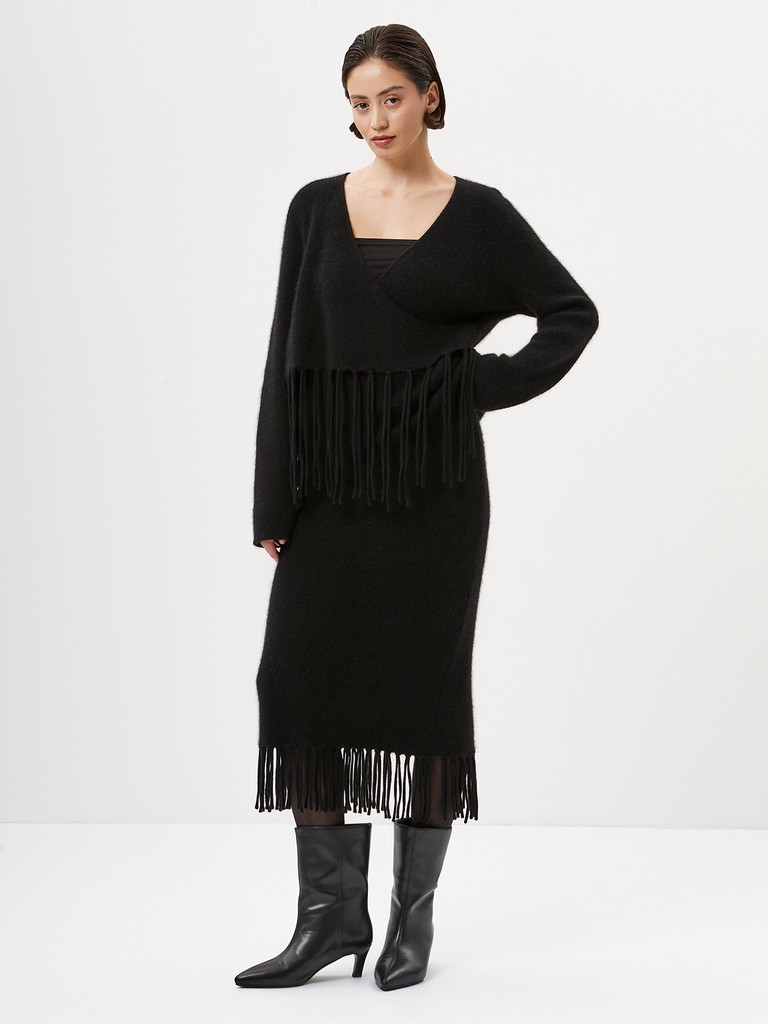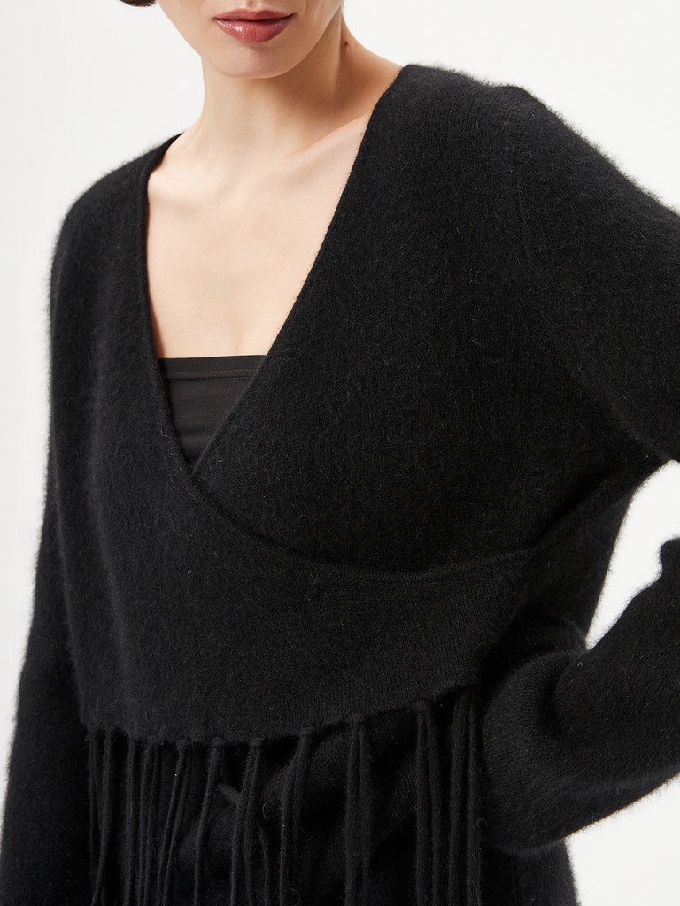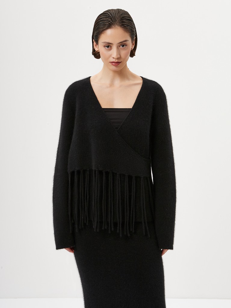 Женский вязаный джемпер полуприлегающего силуэта— черная модель с запахом с отделкой декоративной бахромой, спускающейся от талии. Узкие длинные рукава подчеркивают силуэт, а свободный крой добавляет образу легкости и динамики.