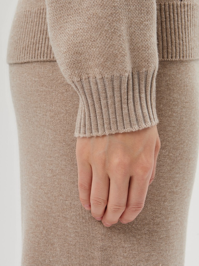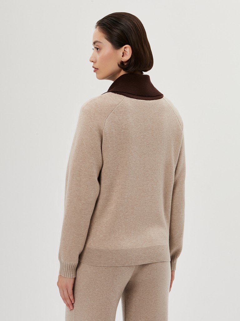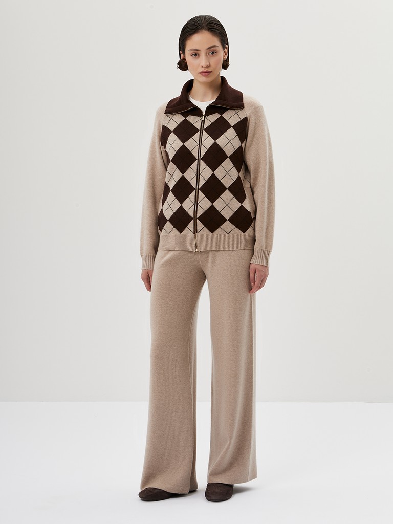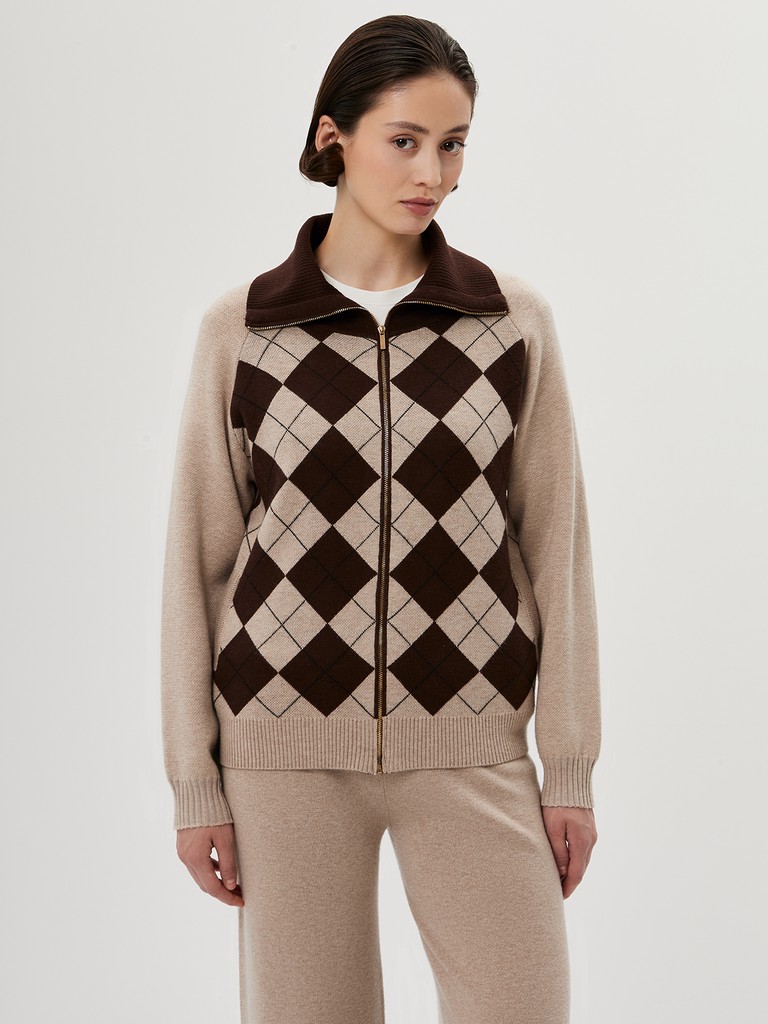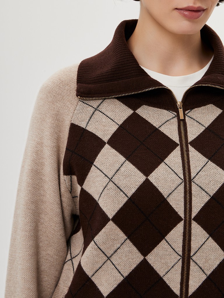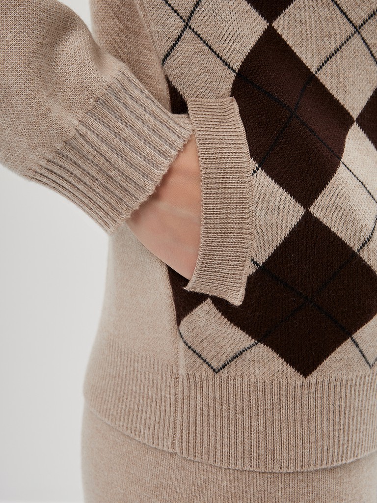 Женский кардиган средней длины гладкой вязки с геометрическим орнаментом в виде ромбов. Застёгивается на молнию, имеет отложной воротник и длинные рукава. Дополнен практичными прорезными карманами. Мягкая пряжа и классический бежевый оттенок делают его универсальной вещью на каждый день. В пару к изделию предлагаются трикотажные брюки из нашей коллекции.