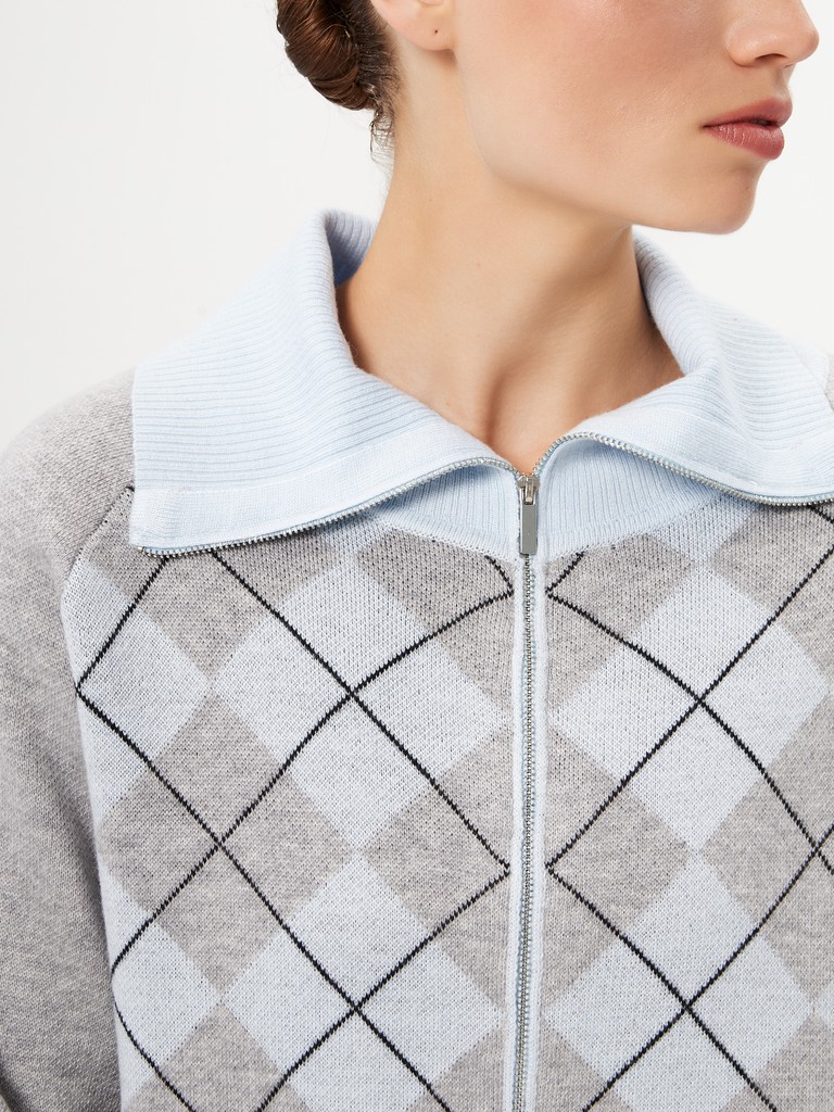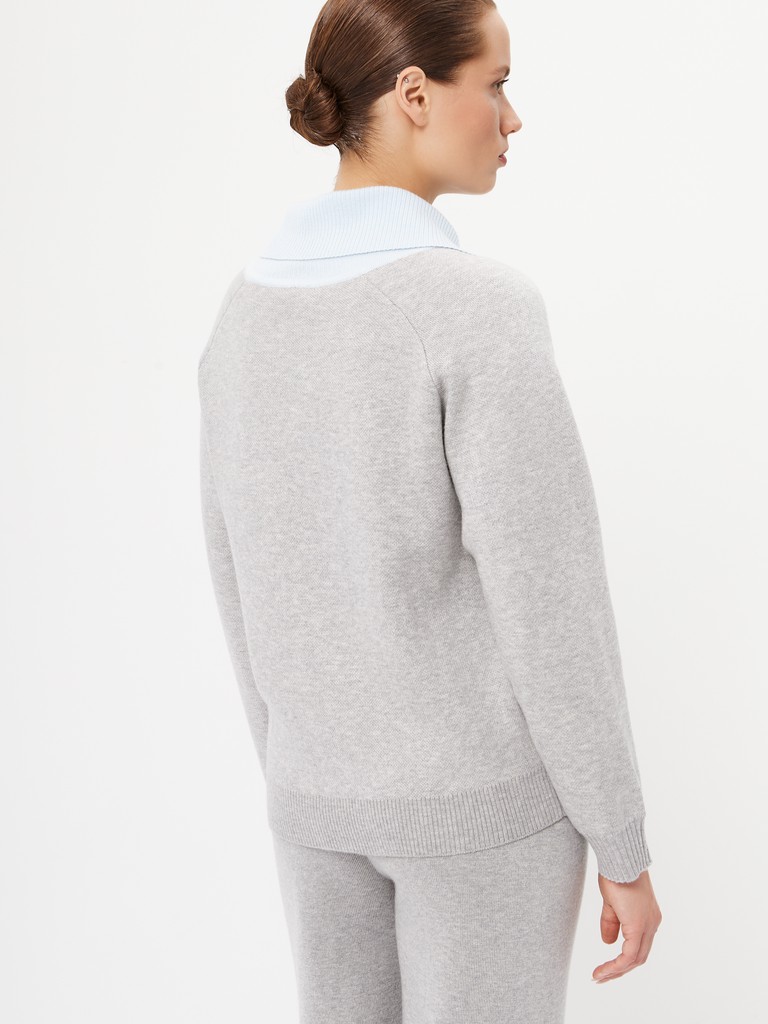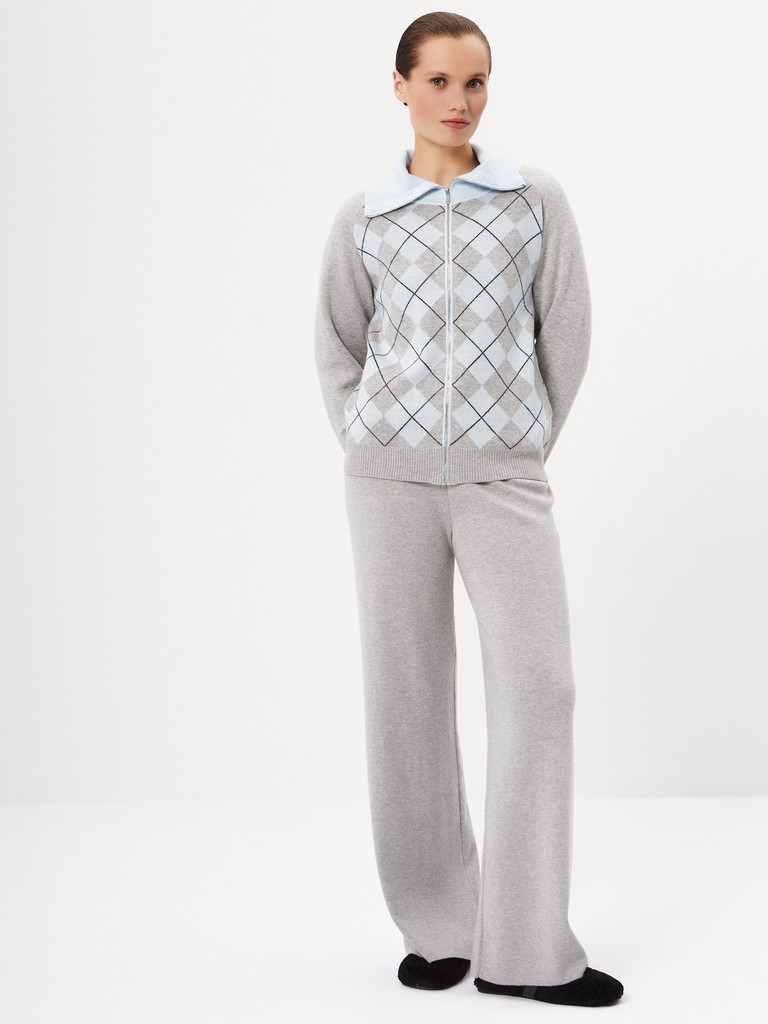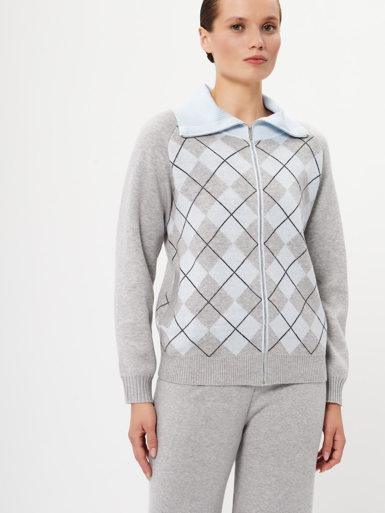 Женский кардиган средней длины гладкой вязки с геометрическим орнаментом в виде ромбов. Застёгивается на молнию, имеет отложной воротник и длинные рукава реглан. Дополнен практичными прорезными карманами. Мягкая пряжа и классический серый оттенок делают его универсальной вещью на каждый день. В пару к изделию предлагаются трикотажные брюки из нашей коллекции.