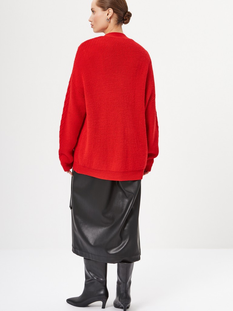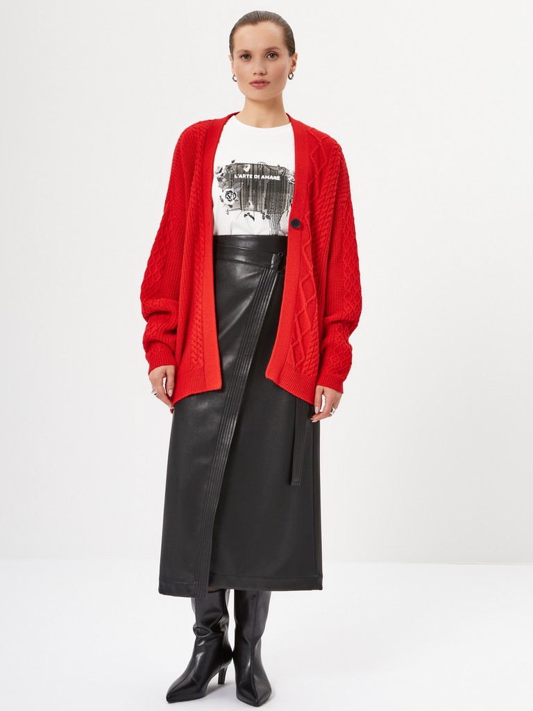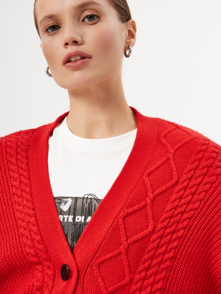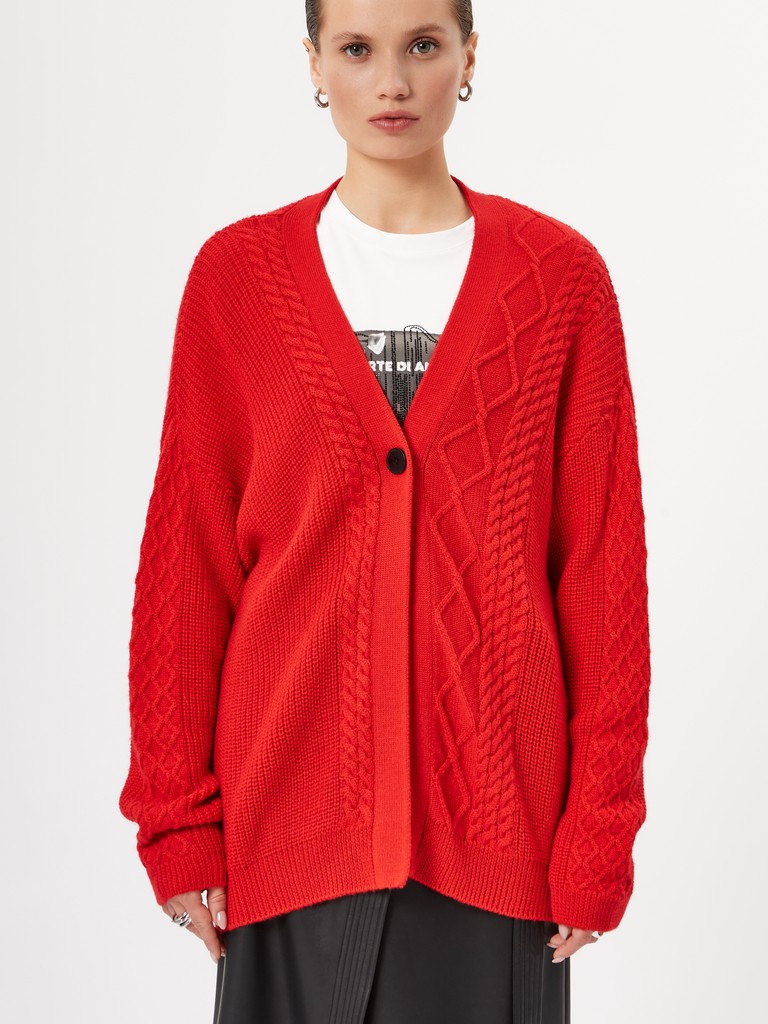 Женский вязаный кардиган ярко-красного цвета– свободный оверсайз силуэт с выразительным рельефным узором на передней части. Модель с длинными рукавами и минималистичной застежкой на одну пуговицу. Создайте яркий акцент для смелых образов и сочетайте с брюками или джинсами из нашей коллекции.