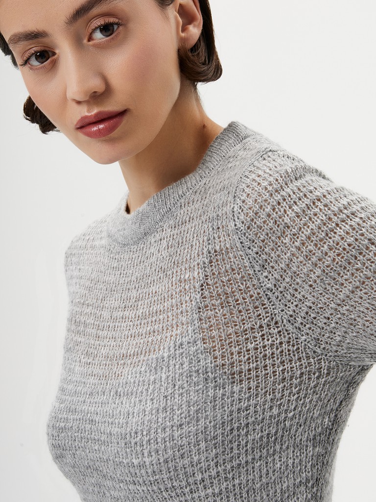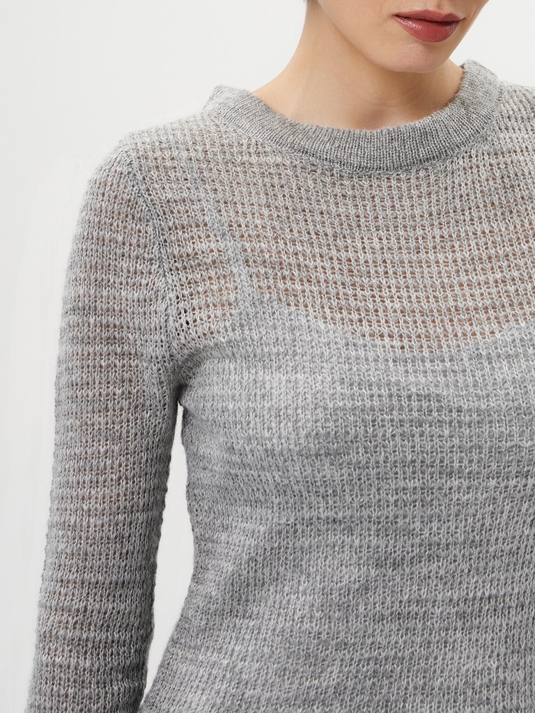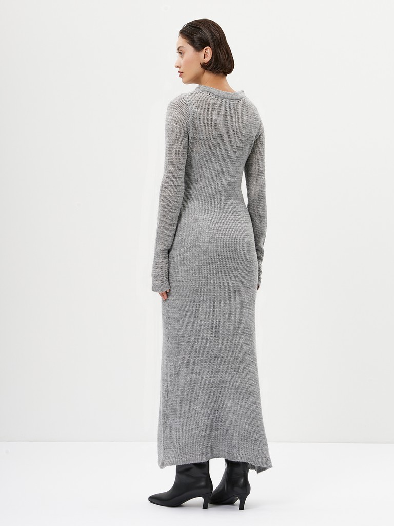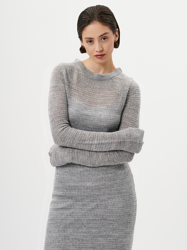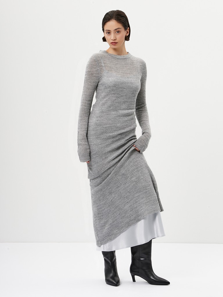 Женское вязаное платье прилегающего силуэта длины макси с округлой горловиной и длинными рукавами. В комплекте - нижнее платье из струящейся вискозы с косым кроем, которое можно носить как самостоятельное изделие.