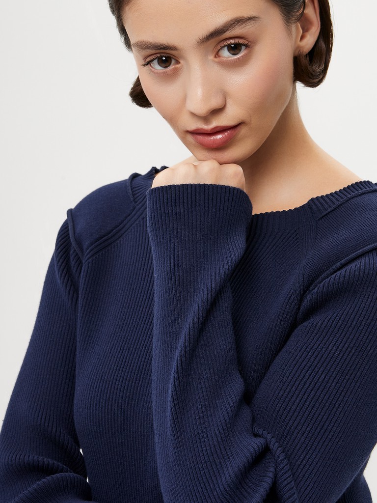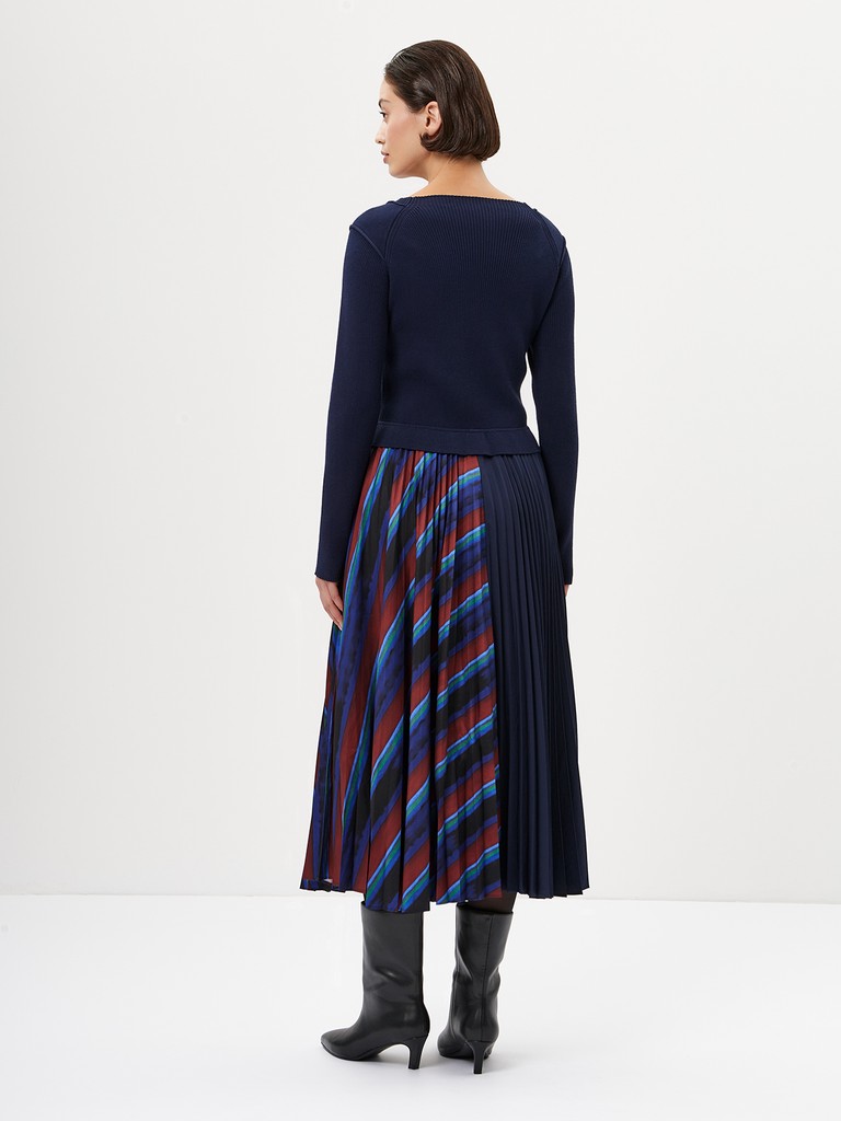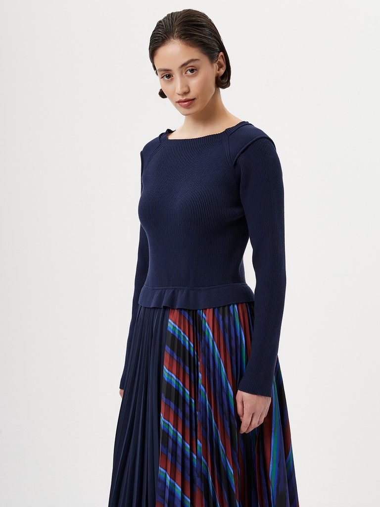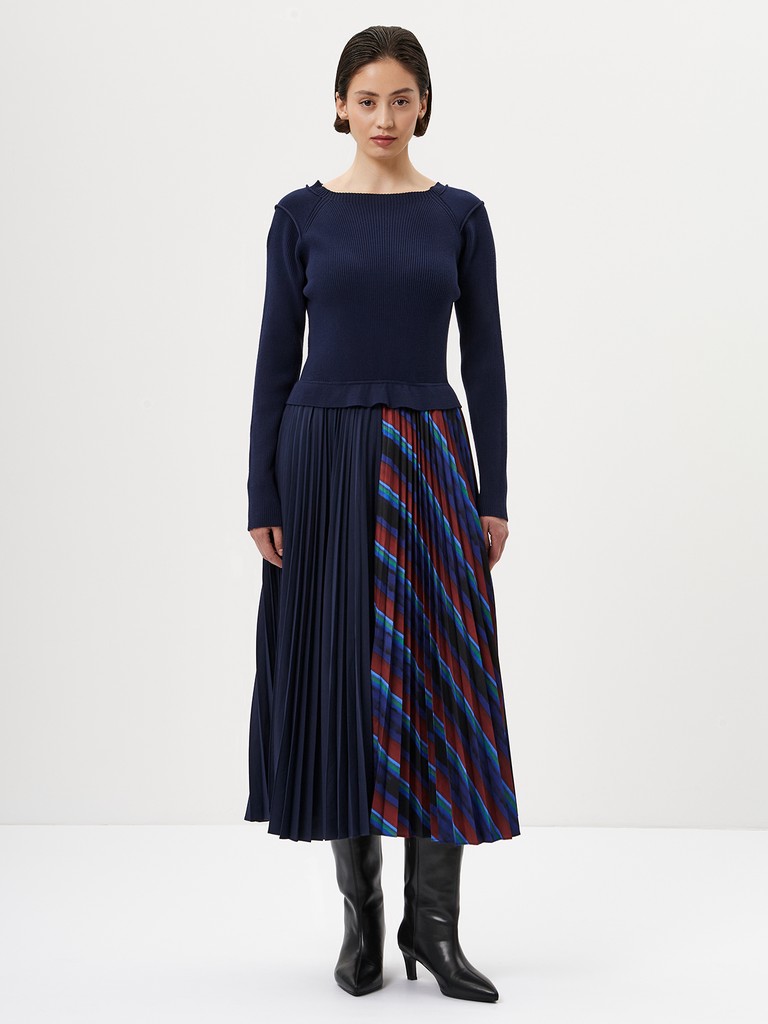 Женское платье А-силуэта с комбинированным дизайном: прилегающий вязаный лиф с ребристой вязкой и пышная плиссированная юбка-полусолнце. Удлиненные рукава мягко облегают запястье, сохраняя свободу движений. Элегантный контраст текстур и продуманный крой создают образ утонченной женственности.