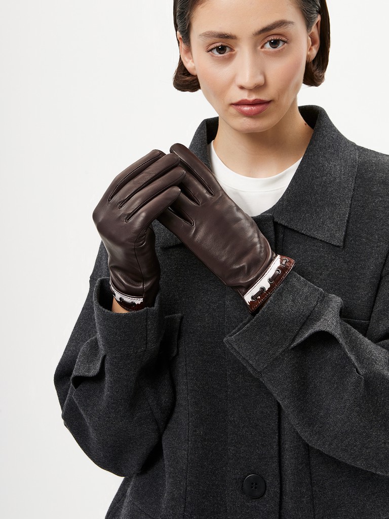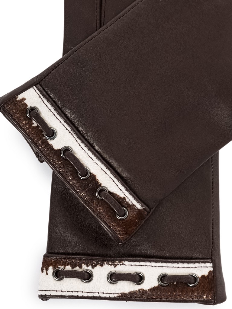 Перчатки женские торговой марки ELEGANZZA. Выполнены из высококачественной натуральной кожи ягненка на подкладе из мягкой шерсти. Трендовая анималистичная отделка: манжета из стриженного меха контрастного цвета, украшенная продержкой из тонкого кожаного шнурка, выполнена вручную и с особой тщательностью. Подгибка изделия выполнена с помощью уникальной технологии, объединяющей в себе преимущества ручной техники - эластичность и удобство посадки и машинной - эстетика и безупречная внутренняя отделка. Технология, по которой выполнена подгибка на манжете этих перчаток - эксклюзивная разработка и фирменное отличие бренда Eleganzza. Модель со средней длиной пальцев и длиной манжеты от нижней точки большого пальца до края перчаток - 4.5 см.