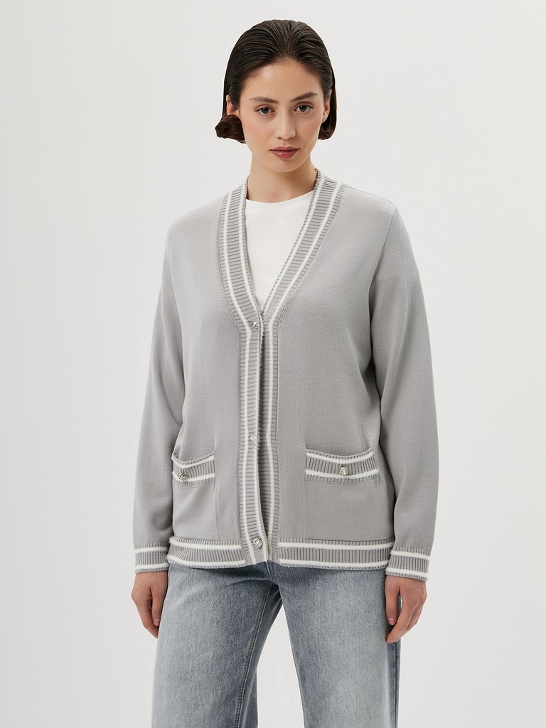 Женский кардиган прямого силуэта, дополненный накладными карманами - изделие, которое легко впишется в любой гардероб. Связан из нежной вискозной пряжи, застегивается на пуговицы. Акцентная деталь - деликатная отделка в виде изящных полосок из белой ворсистой пряжи.