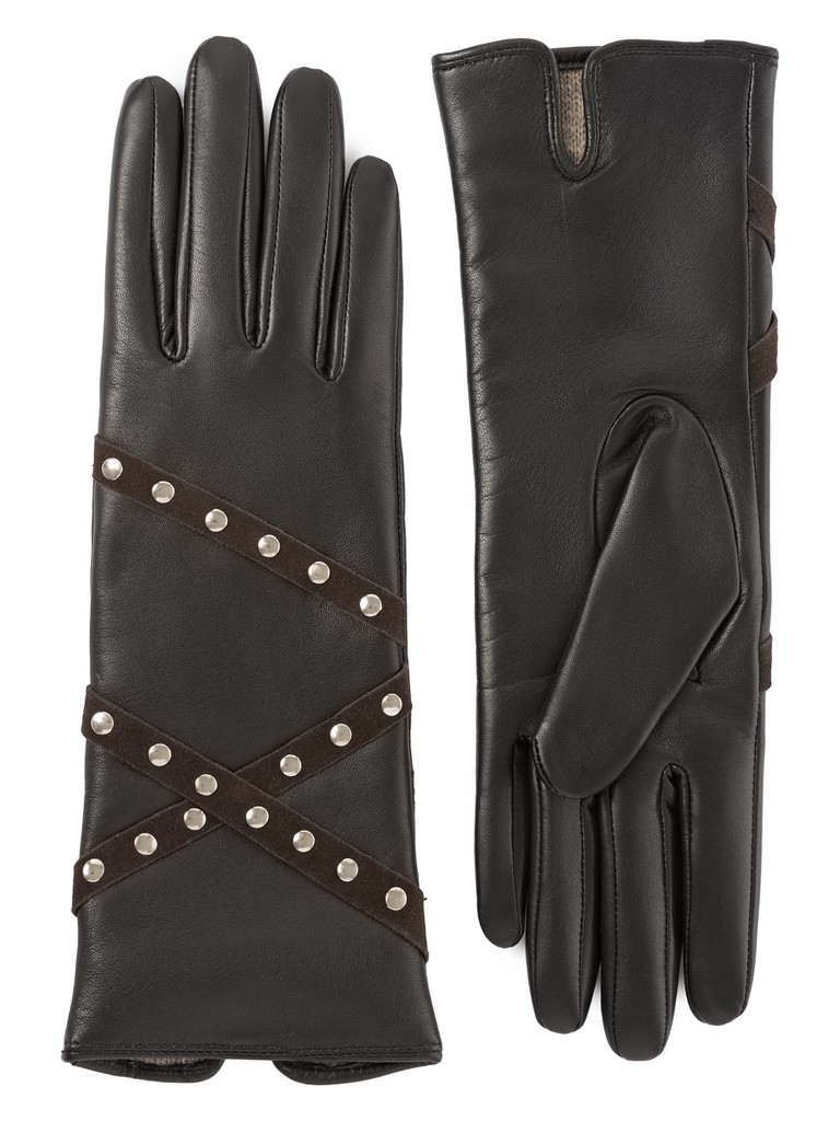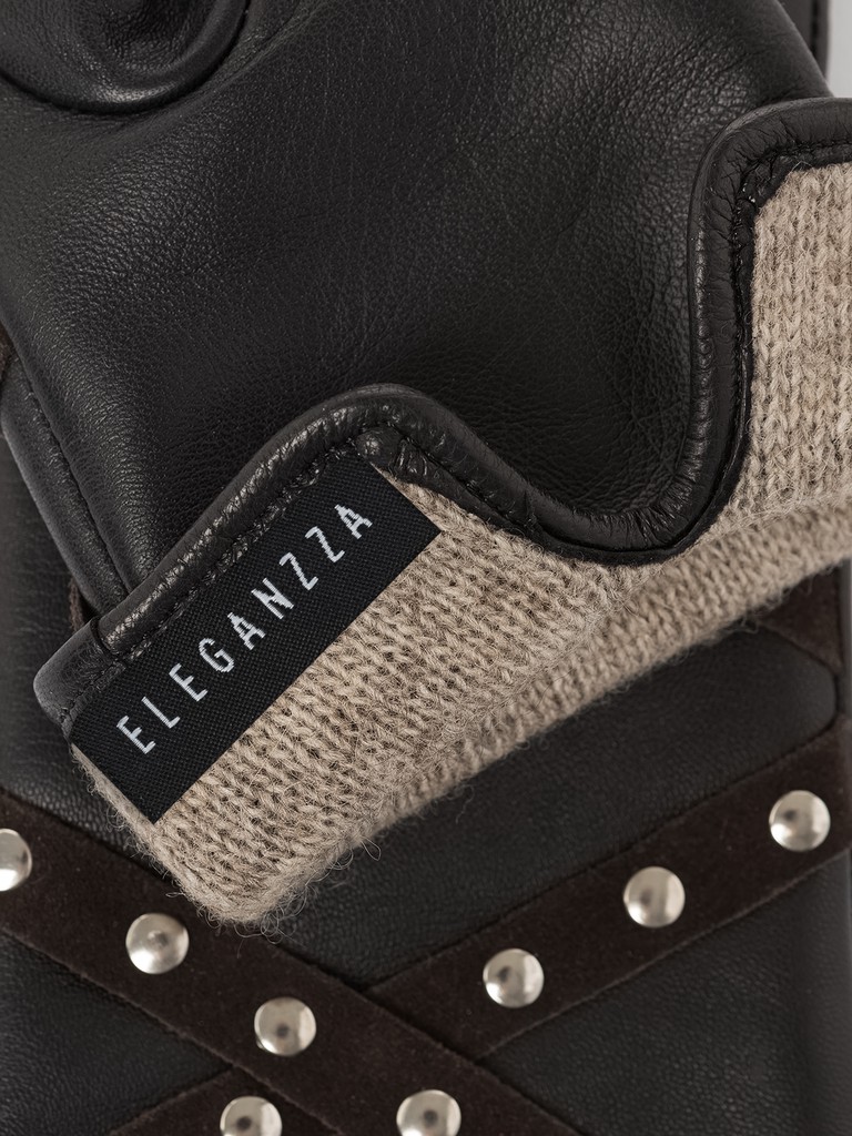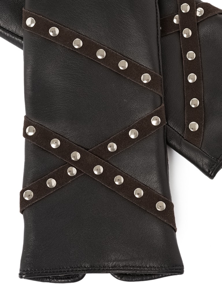 Трендовые удлиненные женские перчатки торговой марки ELEGANZZA. Выполнены из высококачественной натуральной кожи ягненка на мягкой шерстяной подкладке. Лицевая сторона декорирована ремешками, украшенными металлическими хольнитенами. Модель со средней длиной пальцев и длиной манжеты от нижней точки большого пальца до края перчаток - 10 см.