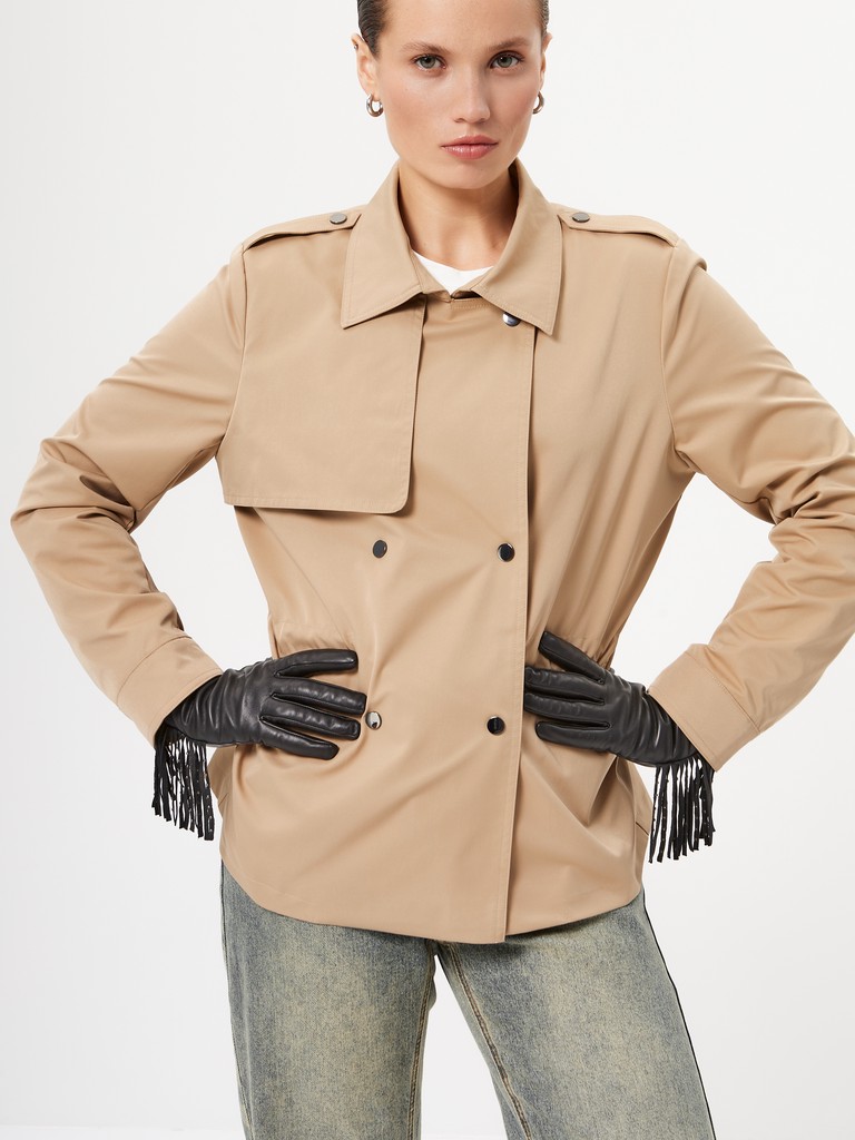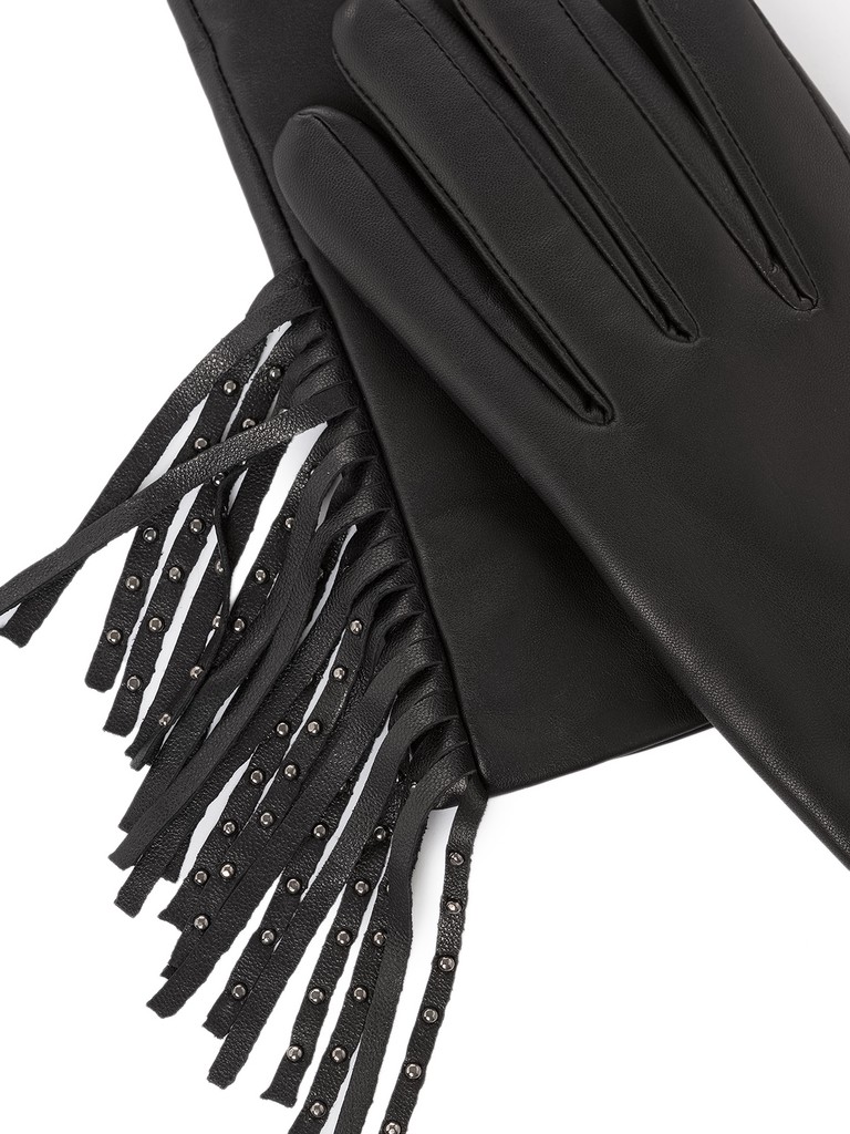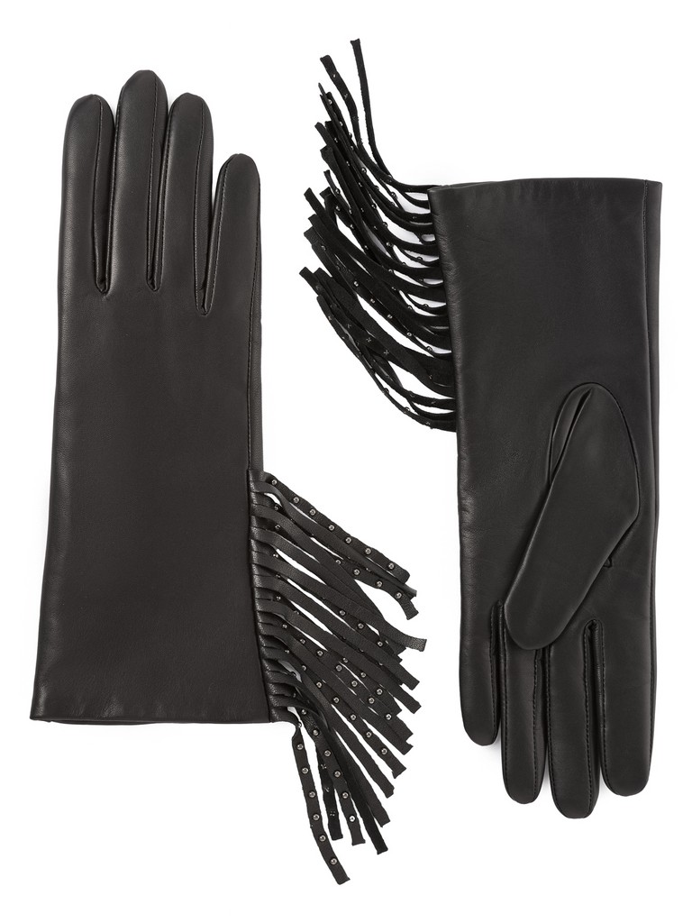 Трендовые женские перчатки торговой марки ELEGANZZA. Выполнены из высококачественной натуральной кожи ягненка на мягкой шерстяной подкладке. Деокорированы бахромой в стиле бохо и украшены металлическими хольнитенами на боковой части. Модель со средней длиной пальцев и длиной манжеты от нижней точки большого пальца до края перчаток - 6 см.