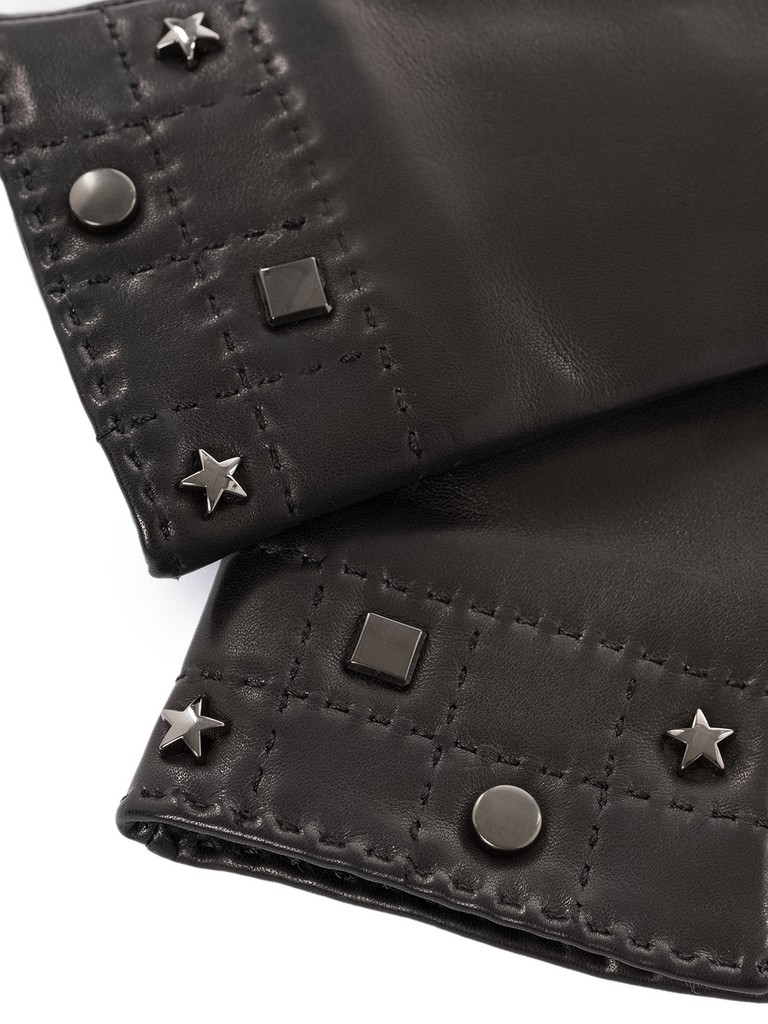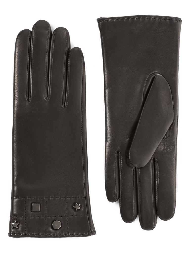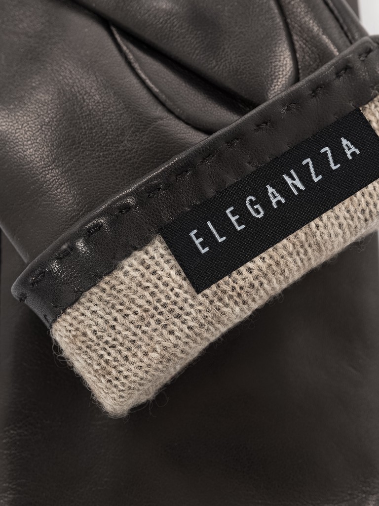 Перчатки женские торговой марки ELEGANZZA. Выполнены из высококачественной натуральной кожи ягненка на мягкой шерстяной подкладке. Манжеты украшены декоративной отстрочкой с добавлением металлических хольнитенов. Модель со средней длиной пальцев и длиной манжеты от нижней точки большого пальца до края перчаток - 6 см.