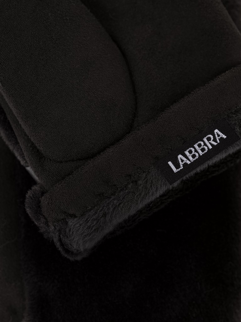 Митенки женские торговой марки LABBRA. Выполнены из трикотажа и дополнены искуссвенным мехом. Украшены лаконичным кожаным ремешком с небольшой металлической пряжкой. Модель со средней длиной пальцев и длиной манжеты от нижней точки большого пальца до края перчаток - 5 см.