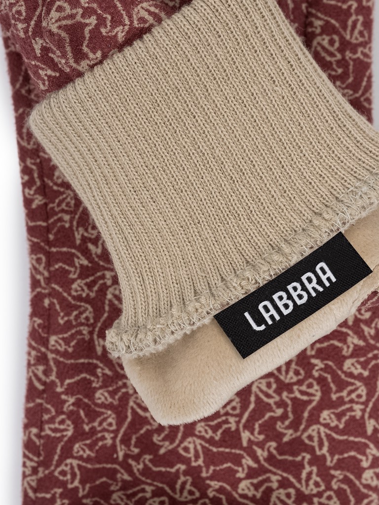 Перчатки женские торговой марки LABBRA. Выполнены из трикотажа и дополнены мягким флисовым подкладом. Декорированы эксклюзивным авторским принтом с символикой бренда - собачкой. Модель со средней длиной пальцев и длиной манжеты от нижней точки большого пальца до края перчаток - 2 см.