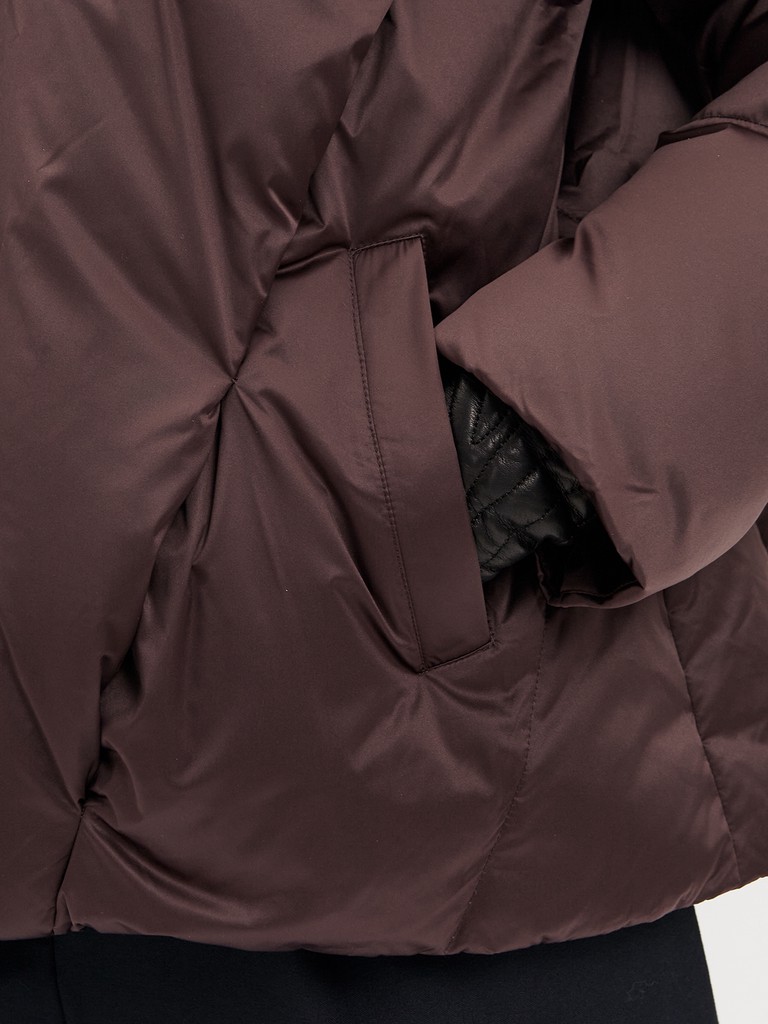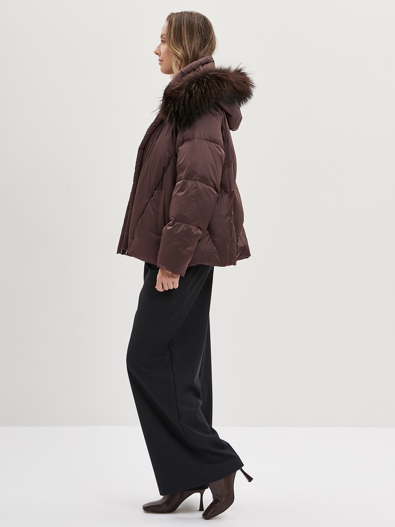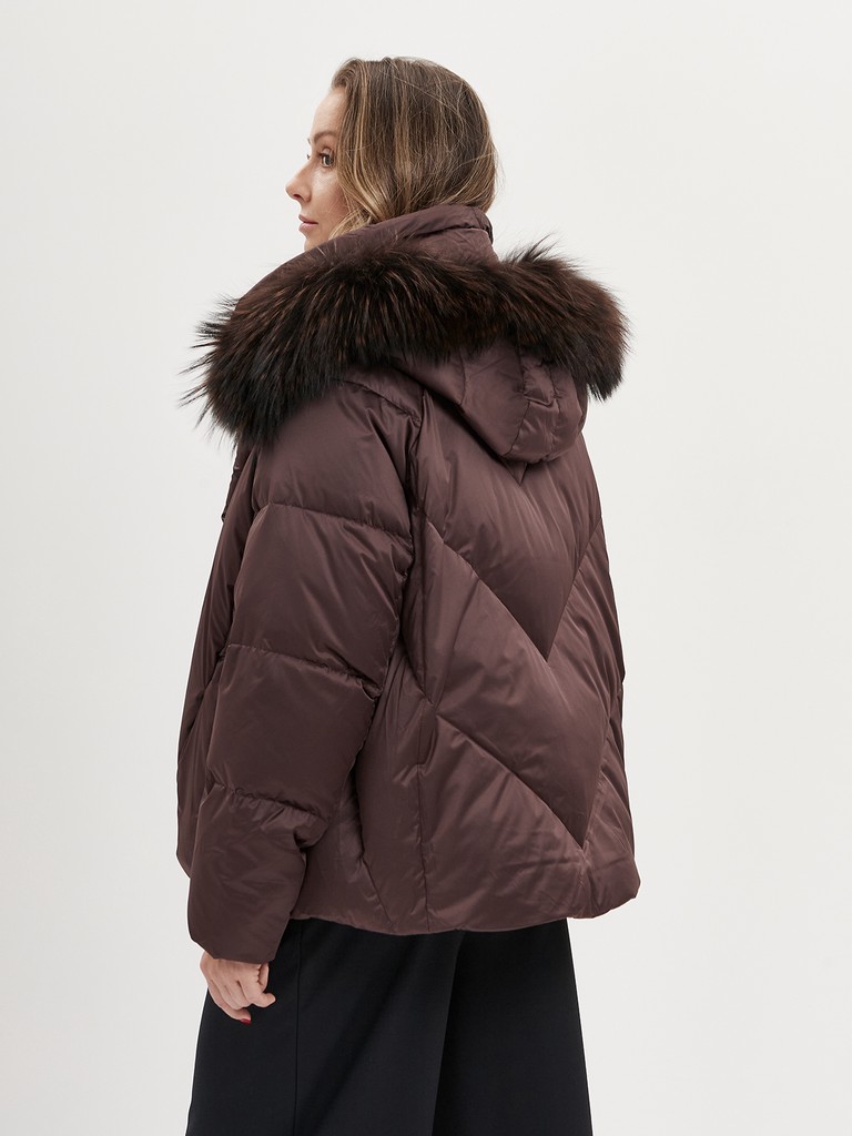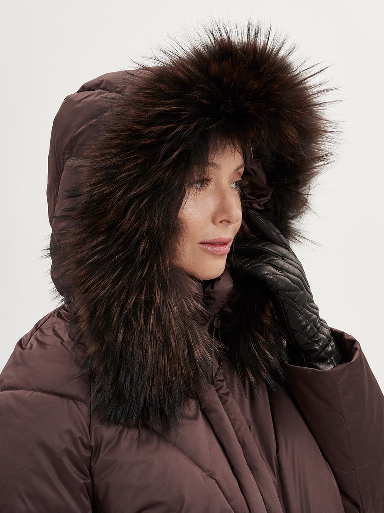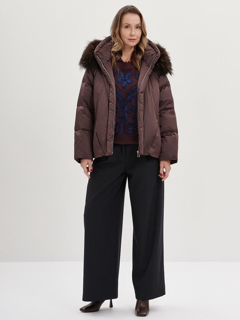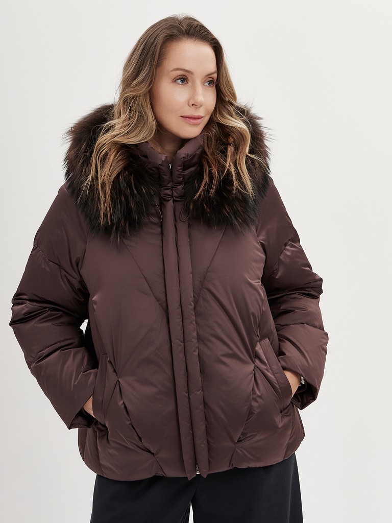 Женская утепленная куртка до бедер в актуальном шоколадном цвете из водоотталкивающего и ветрозащитного полиэстера с пуховым наполнителем. Съемный капюшон с отстрочкой из натурального меха енота, два боковых кармана, застежка на молнии и резинка по низу для комфортной посадки.