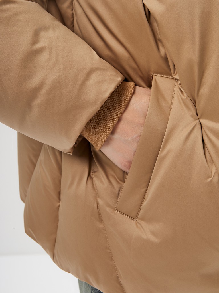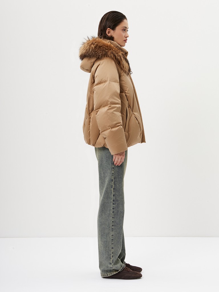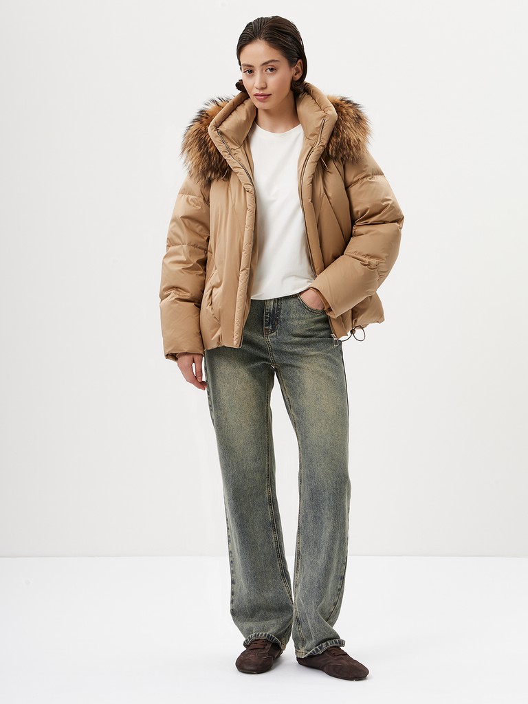 Женская утепленная куртка до бедер в актуальном золотом цвете из водоотталкивающего и ветрозащитного полиэстера с пуховым наполнителем. Съемный капюшон с отстрочкой из натурального меха енота, два боковых кармана, застежка на молнии и резинка по низу для комфортной посадки.