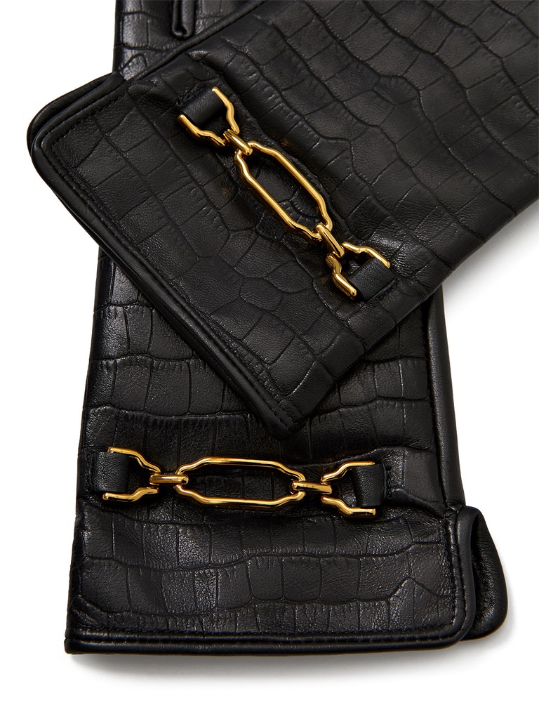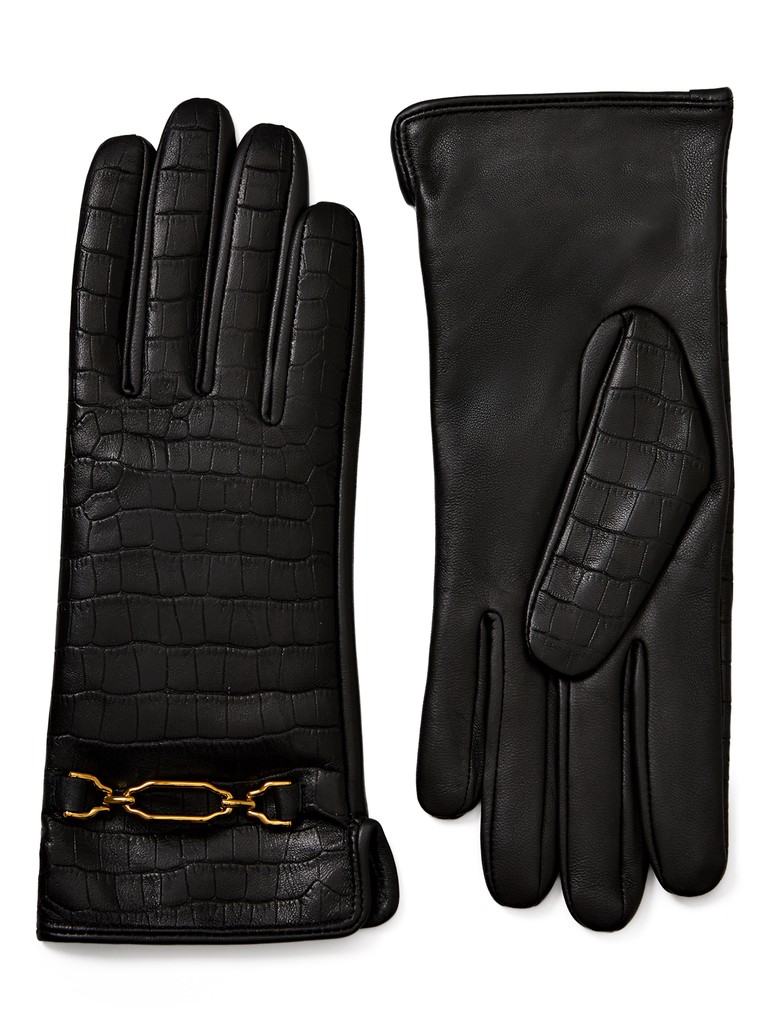 Перчатки женские торговой марки LABBRA из высококачественной кожи ягненка на подкладе из нежного шелка. Изделие дополнено трендовой отделкой - тиснением под крокодила и декоративной фурнитурой цвета античного золота, вторящей линиям фактуры кожи. Модель со средней длиной пальцев и длиной манжеты от нижней точки большого пальца до края перчаток - 6 см.