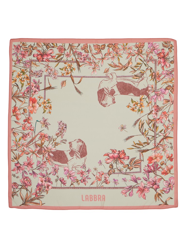 Женский платок торговой марки Labbra, выполненный из нежного шелка с добавлением вискозы. Изделие дополнено авторским принтом с изображением фирменной символики бренда - собачки, как будто гуляющей в саду среди флоральных мотивов. Края изделия обработаны машинной подгибкой. В пару к платку предлагается стильный зонт-автомат в том же дизайне.