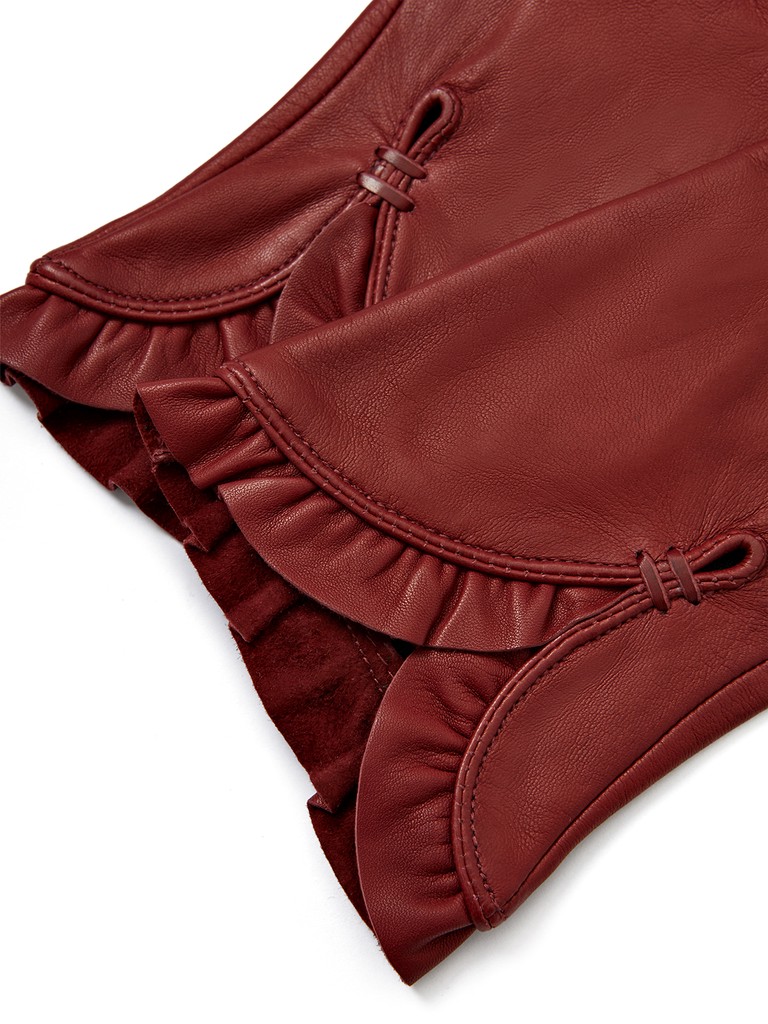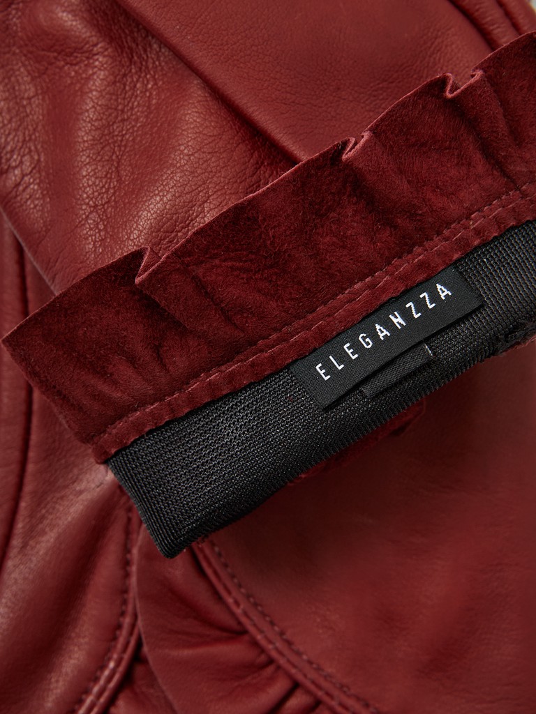 Перчатки женские торговой марки ELEGANZZA. Выполнены из высококачественной натуральной кожи ягненка и дополнены подкладом из искусственного шелка. Новинка в коллекции - модель украшена изысканным женственным декором в виде разреза в форме капли, обрамленного рюшами. Изделие со средней длиной пальцев и длиной манжеты от нижней точки большого пальца до края перчаток - 2 см.
