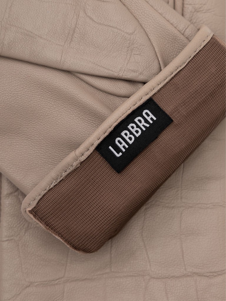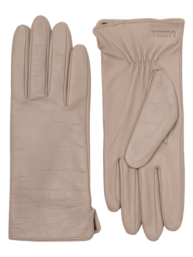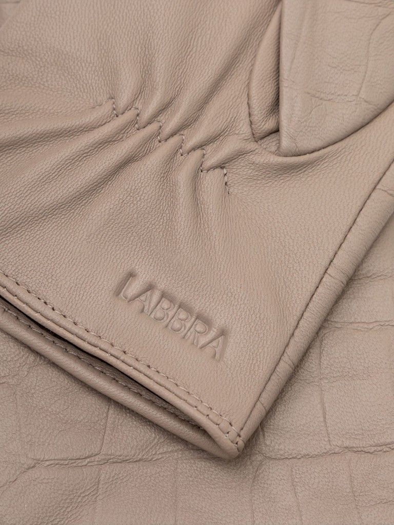 Перчатки женские торговой марки LABBRA из высококачественной кожи ягненка на подкладе из нежного шелка. Изделие дополнено трендовой отделкой - тиснением под крокодила. Модель со средней длиной пальцев и длиной манжеты от нижней точки большого пальца до края перчаток - 6 см.