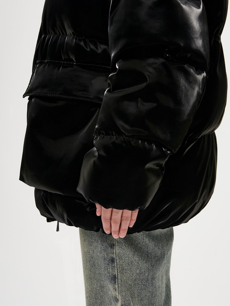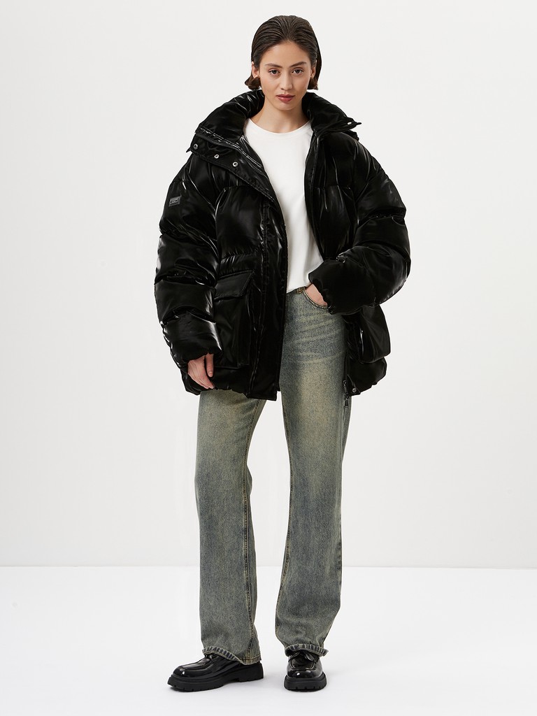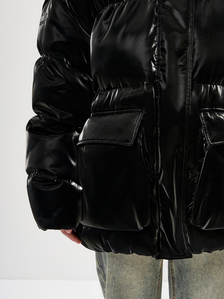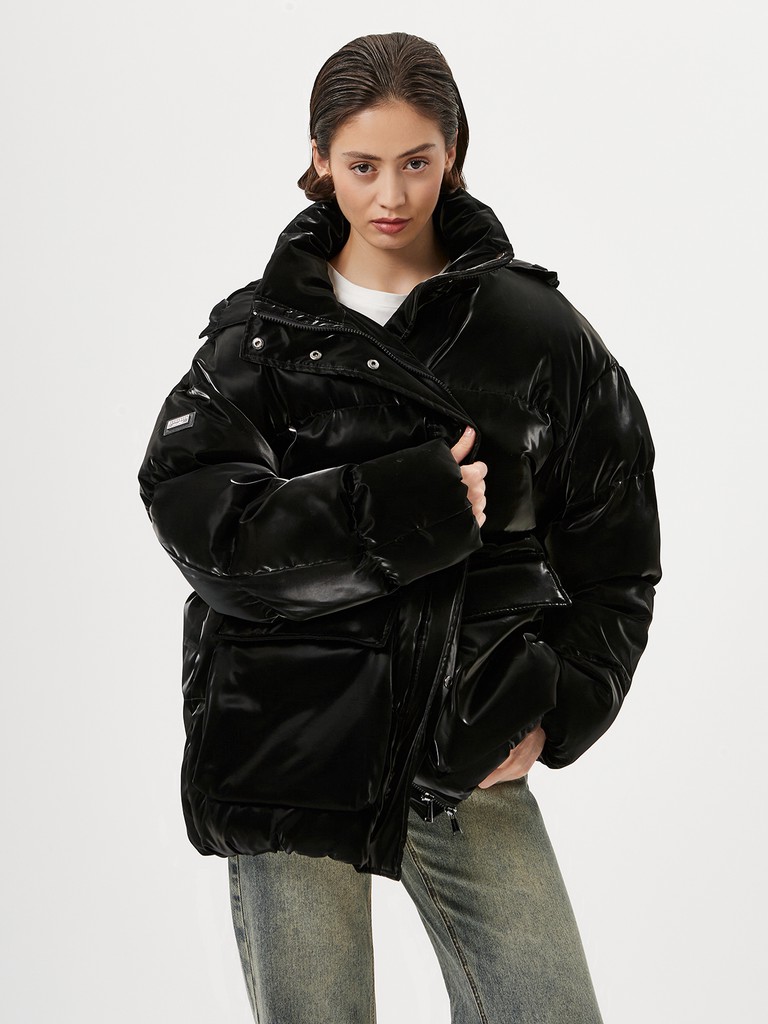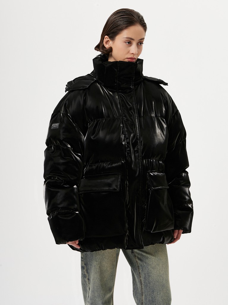 Эксклюзивно от ELEGANZZA - яркая и стильная объемная женская куртка с наполнителем из 100% полиэстера. Модель черного цвета с эффектом прозрачной глазури на поверхности. Куртка с высоким воротником на кнопках, капюшоном с утяжками идеально подходит для носки зимой и в период холодного межсезонья.
