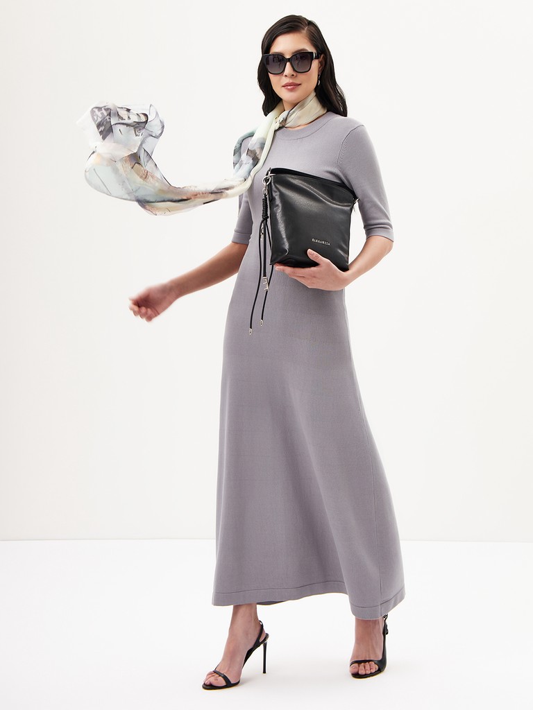 Женская сумка торговой марки Eleganzza выполнена из натуральной кожи с трендовой фактурой «мятый эффект» и мягким блеском — словно с внутренним сиянием. Особенность модели — ручка-трансформер: она снимается, карабин перестёгивается, и ручка становится длинной. На задней стенке расположен карман на молнии. Высота ручки — 35 см. Максимальная длина регулируемого съёмного плечевого ремня — 80 см, ширина — 1,5 см. Модель не имеет ножек на дне.
