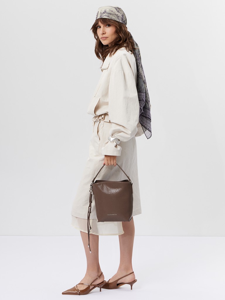 Женская сумка торговой марки Eleganzza выполнена из натуральной кожи с трендовой фактурой «мятый эффект» и мягким блеском — словно с внутренним сиянием. Особенность модели — ручка-трансформер: она снимается, карабин перестёгивается, и ручка становится длинной. На задней стенке расположен карман на молнии. Высота ручки — 35 см. Максимальная длина регулируемого съёмного плечевого ремня — 80 см, ширина — 1,5 см. Модель не имеет ножек на дне.