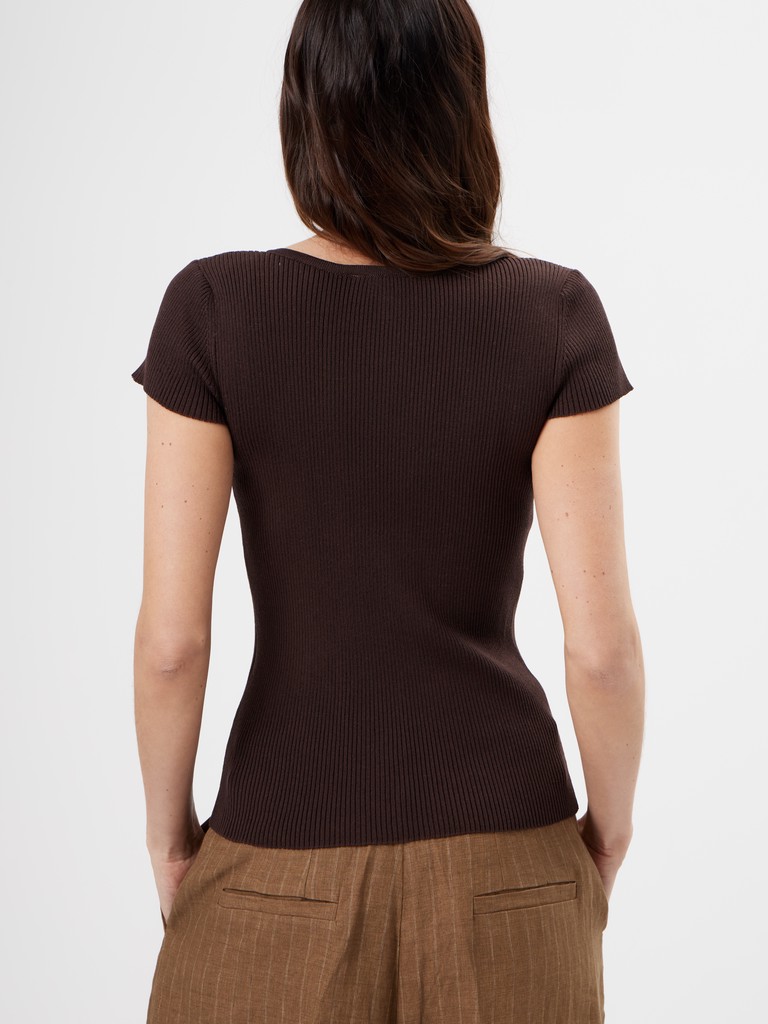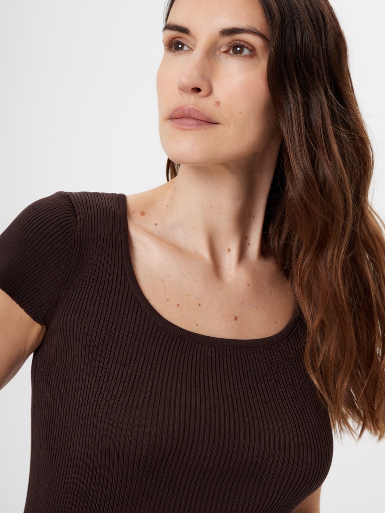 Трикотажная футболка с овальным вырезом. Облегающий крой, мягкий материал из 100% тенселя. Ткань приятная на ощупь, дышащая, хорошо драпируется и сохраняет форму. Коричневый цвет — спокойный, естественный оттенок, который легко встраивается в базовый гардероб.