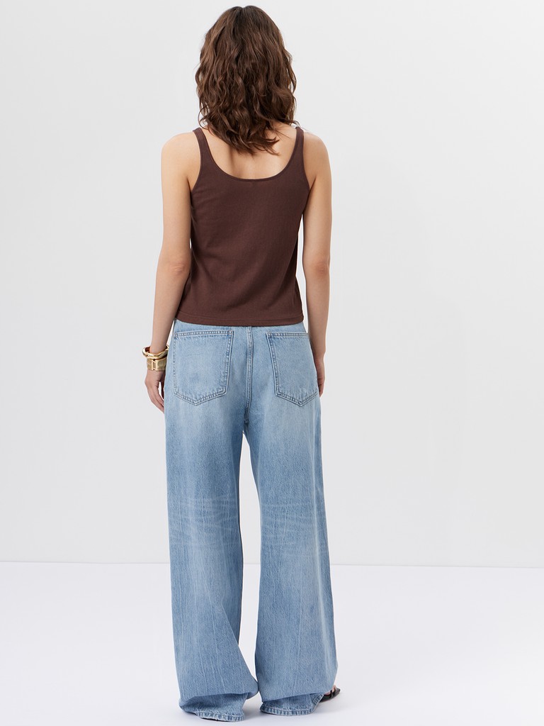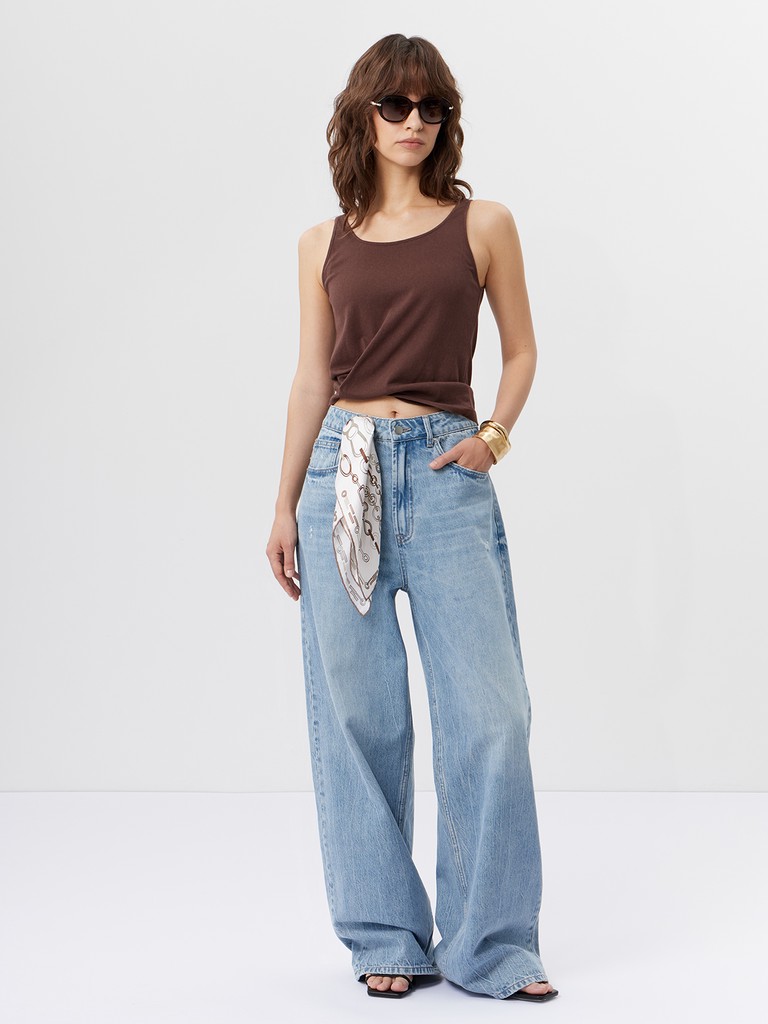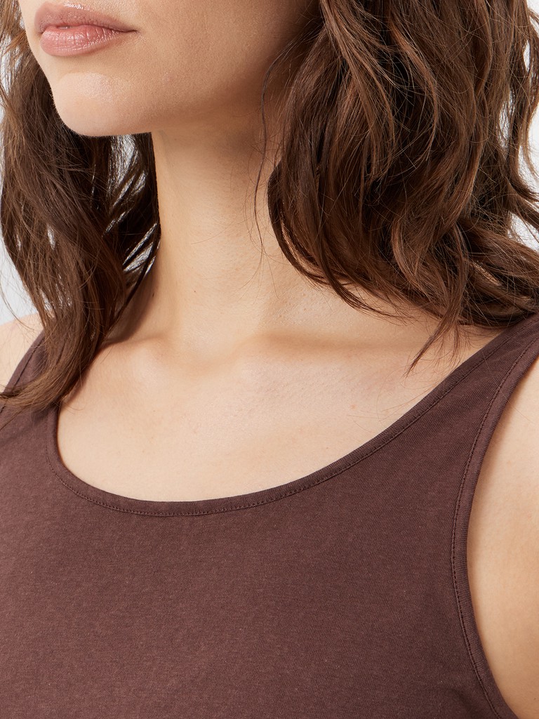 Базовая майка прямого крояс тонкими лямками. Материал из хлопка с добавлением полиэстера приятный на ощупь, дышащий и устойчивый к вытягиванию. Коричневый цвет добавляет глубины и делает майку самостоятельной деталью, а не просто фоном.