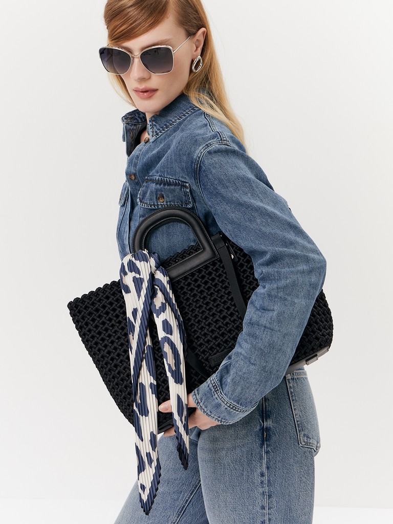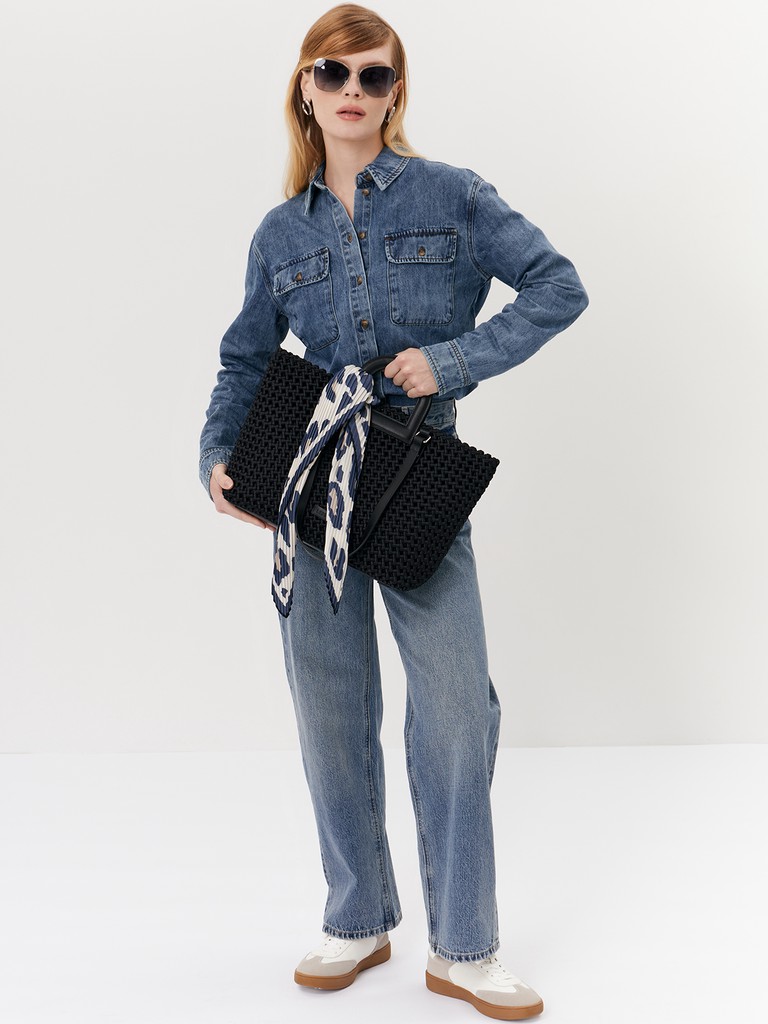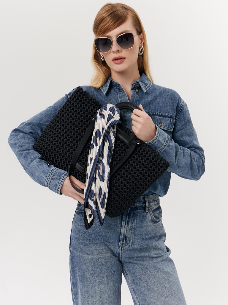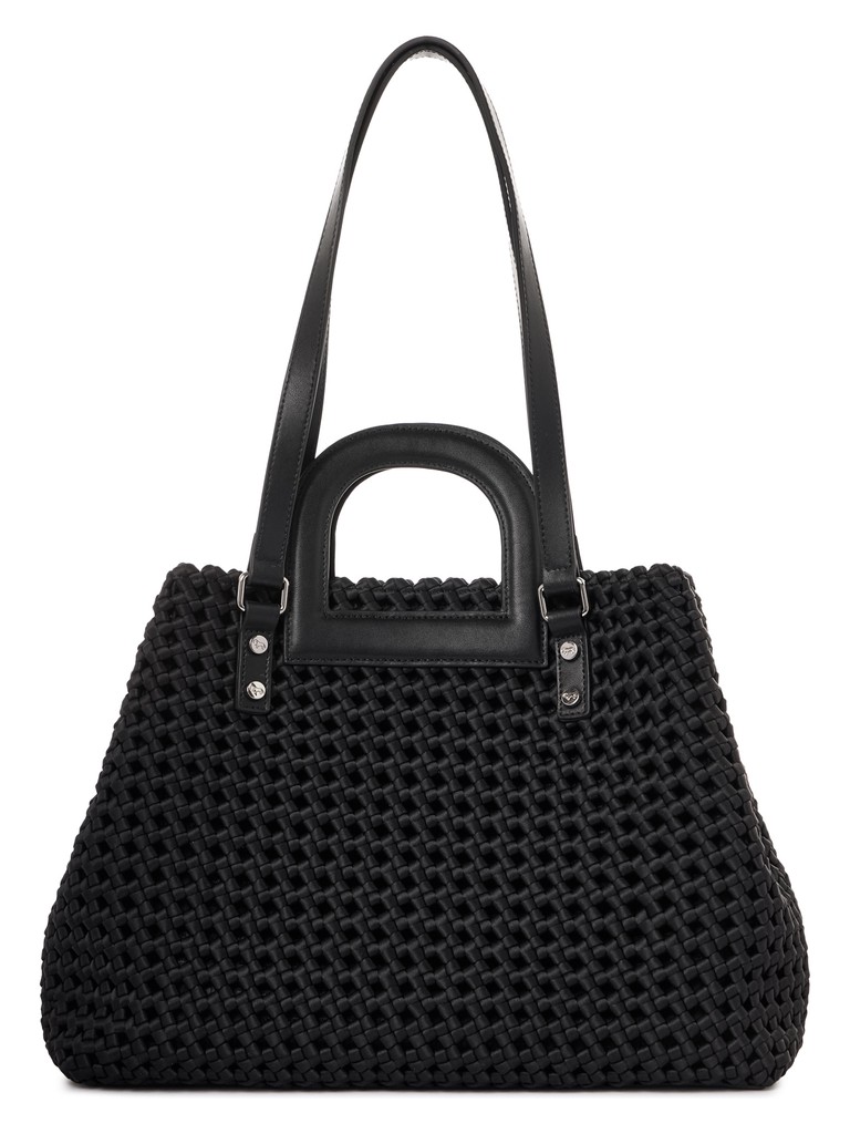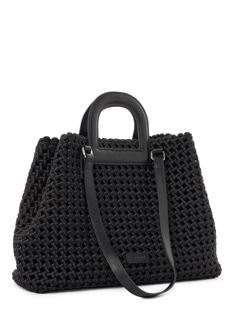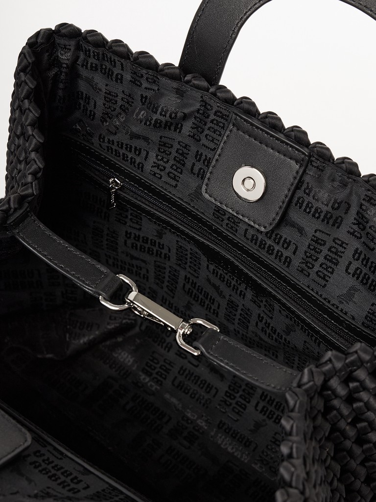 Женская сумка торговой марки Labbra из полиэстера с отделкой из натуральной кожи. Корпус изготовлен вручную с использованием техники плетения, что придает изделию особую прочность. Сумка дополнена подкладом. Модель застегивается на магнитную кнопку и карабин. Внутри одно отделение с двумя карманами на молнии. Высота ручек - 6 см и 30 см. Модель не имеет ножки на дне. Вмещает формат А4.