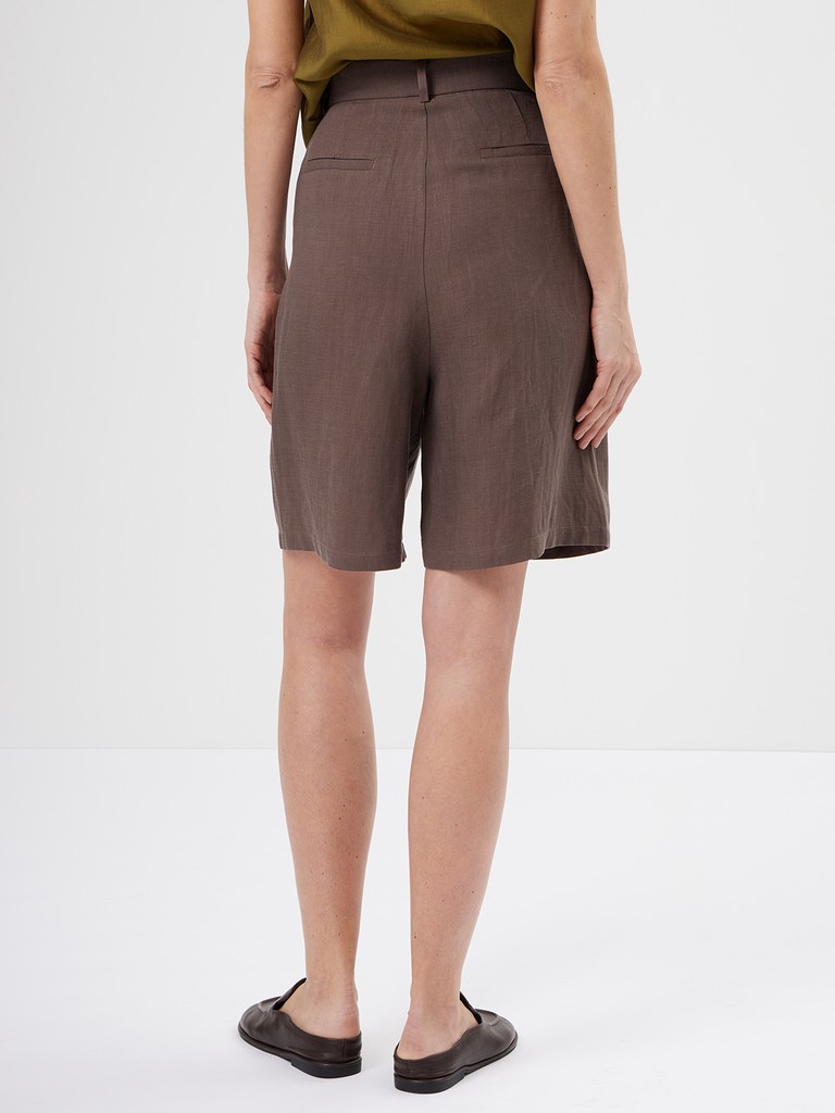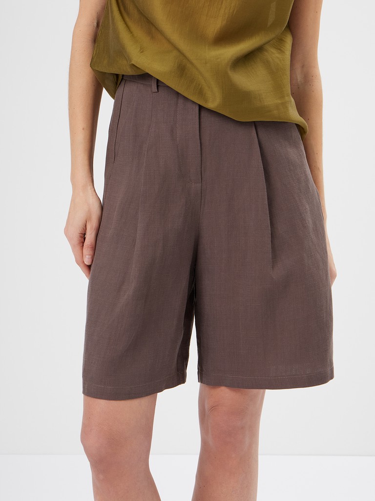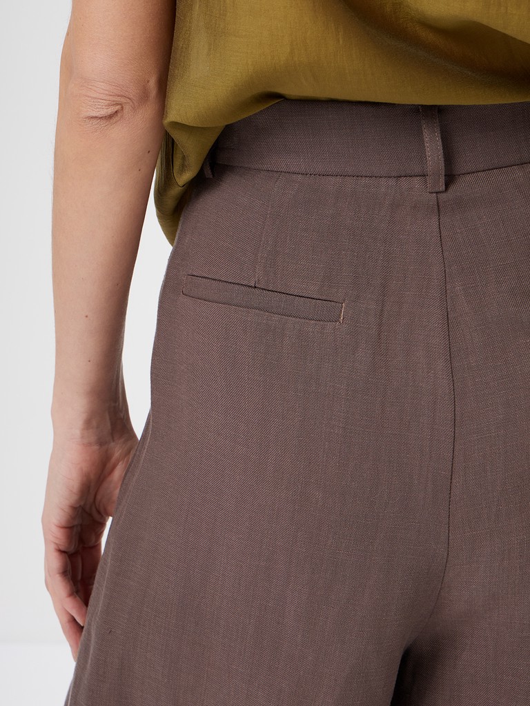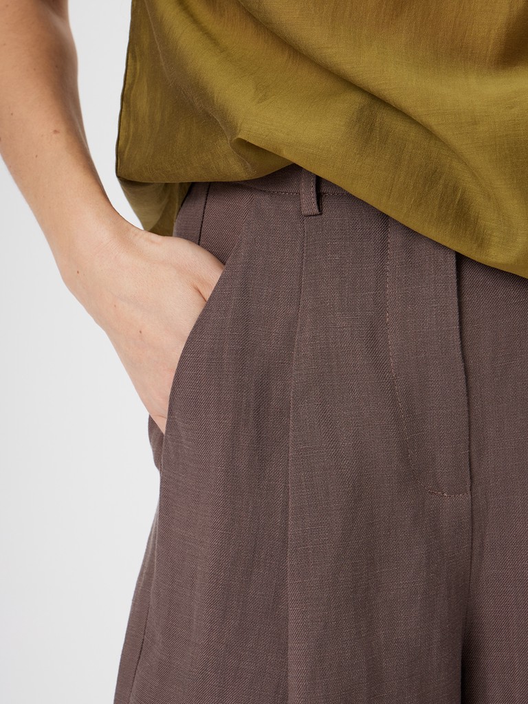 Высокая посадка, классический крой с заложенными складками по переду, которые добавляют объема и формируют четкую графику. Материал — смесовая ткань из тенселя и льна, мягкая, но держит форму.