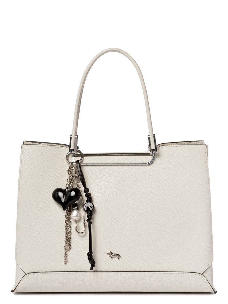 Женская сумка торговой марки Labbra из натуральной кожи. Изделие дополнено съемной подвеской на фирменном кольце-карабине - сердцем из прочного черного пластика в сочетании со шнурком, цепочкой и декоративной булавкой. Можно использовать как брелок для ключей или стильный аксессуар. Модель застегивается на молнию. Внутри одно отделение с карманом на молнии и двумя открытыми карманами. Два дополнительных отделения застегиваются на магнитные кнопки и располагаются со стороны передней и задней стенок. Внутри - открытый карман и кармашки для пластиковых карт. Высота ручек - 15 см. Максимальная длина регулируемого съемного плечевого ремня из натуральной кожи - 102 см, ширина - 1,8 см. Модель имеет ножки на дне. Не вмещает формат А4.