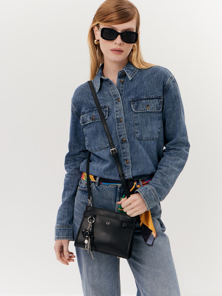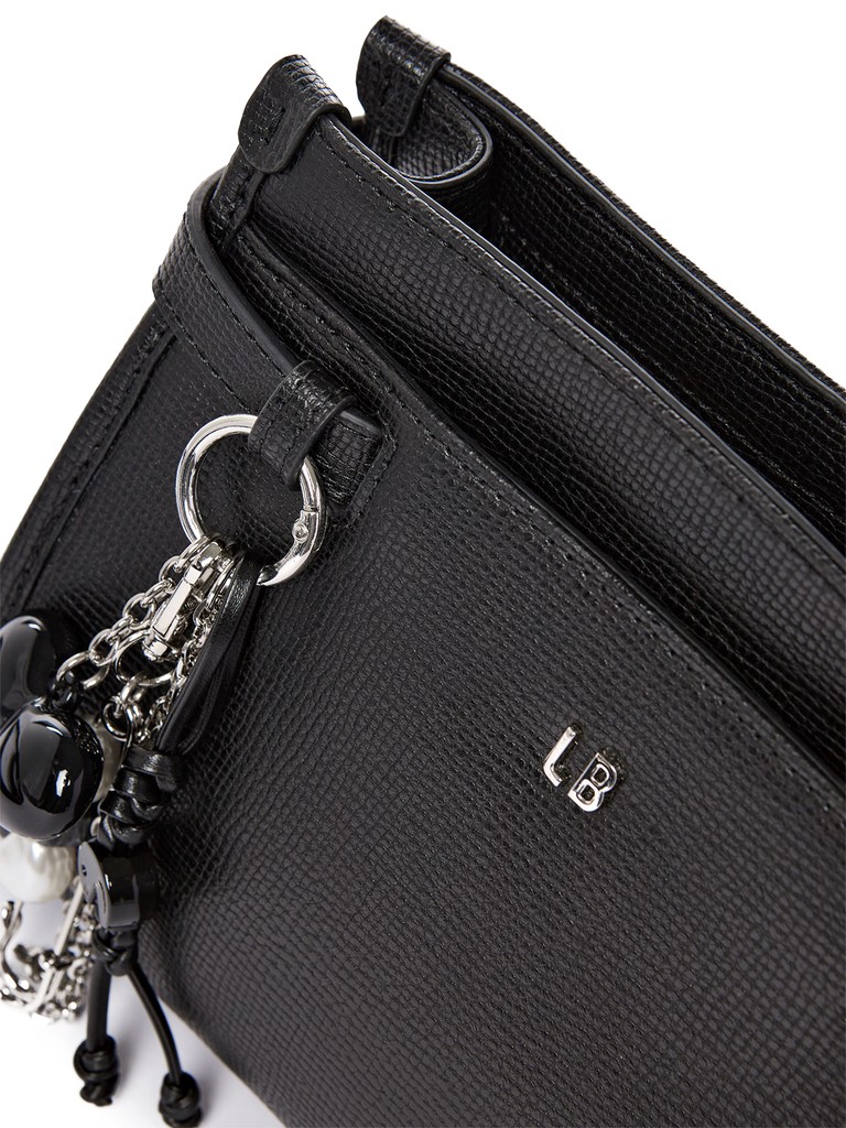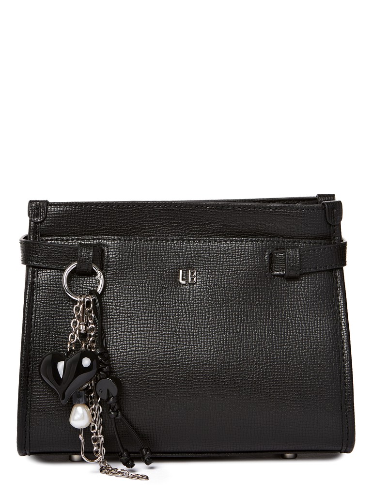 Женская сумка торговой марки Labbra из натуральной кожи. Изделие дополнено съемной подвеской на фирменном кольце-карабине - сердцем из прочного черного пластика в сочетании со шнурком, цепочкой и декоративной булавкой. Можно использовать как брелок для ключей или стильный аксессуар. Модель застегивается на молнию. Внутри одно отделение с карманом на молнии и открытым карманом для телефона. На передней и задней стенках изделия расположен карман на магните. Длина наплечного ремня из натуральной кожи - 118 см., ширина - 1,5 см. Модель имеет ножки на дне. Не вмещает формат А4.