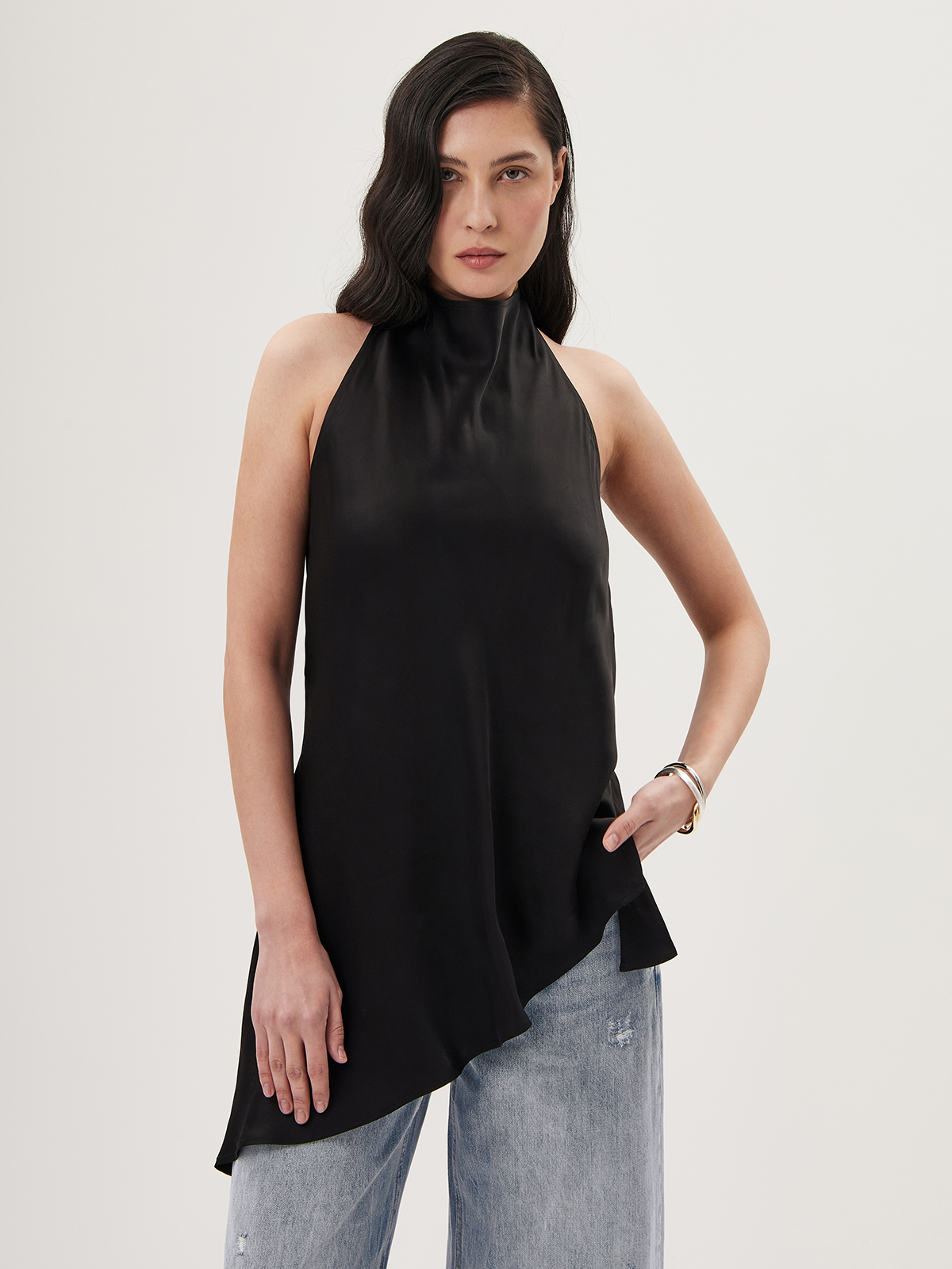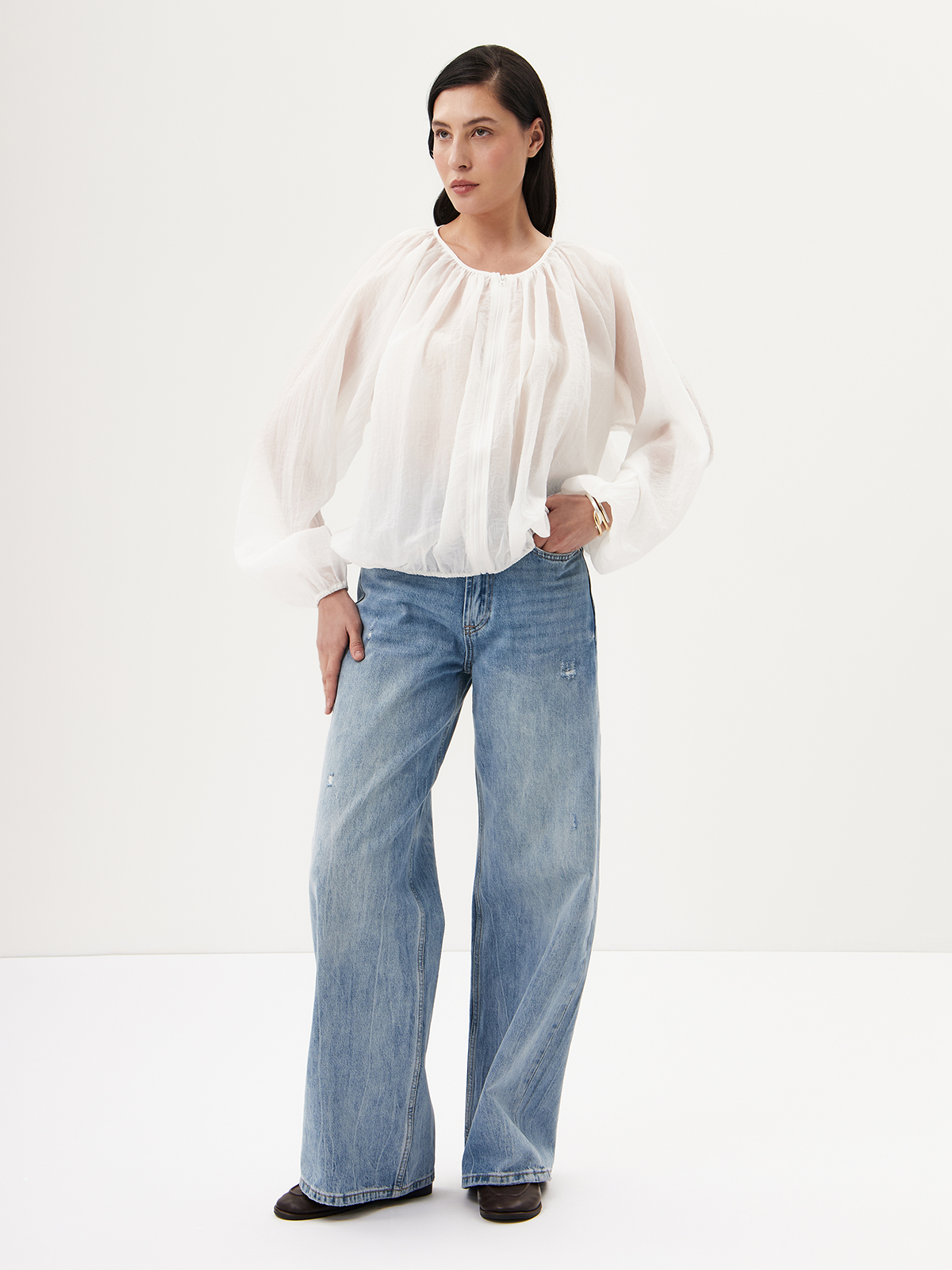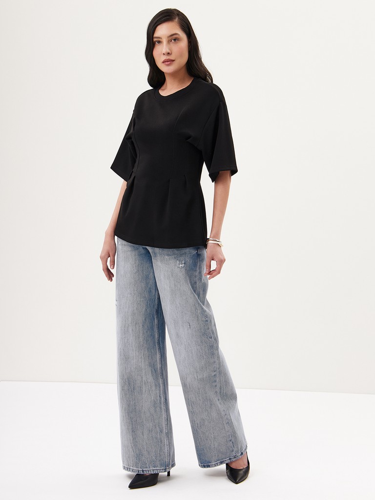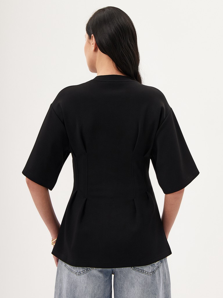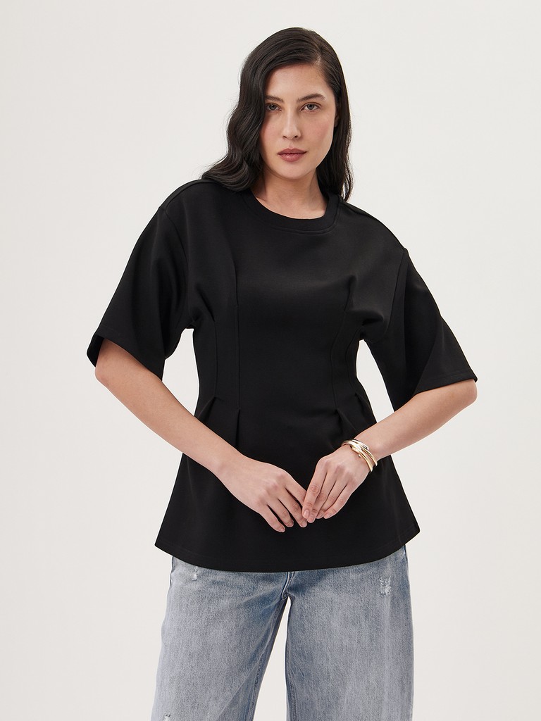 Женская блузка в глубоком черном цвете- которая легко вишется в любой гардероб. Модель из плотного трикотажа с архитектурным кроем и акцентом на талию. Модель с круглой горловиной и свободными рукавами до локтя выглядит минималистично, но за счет вертикальных рельефов и мягких складок по бокам формирует аккуратный силуэт и красиво держит форму.