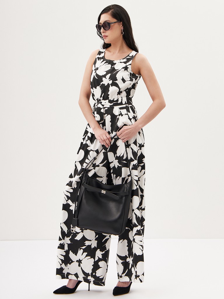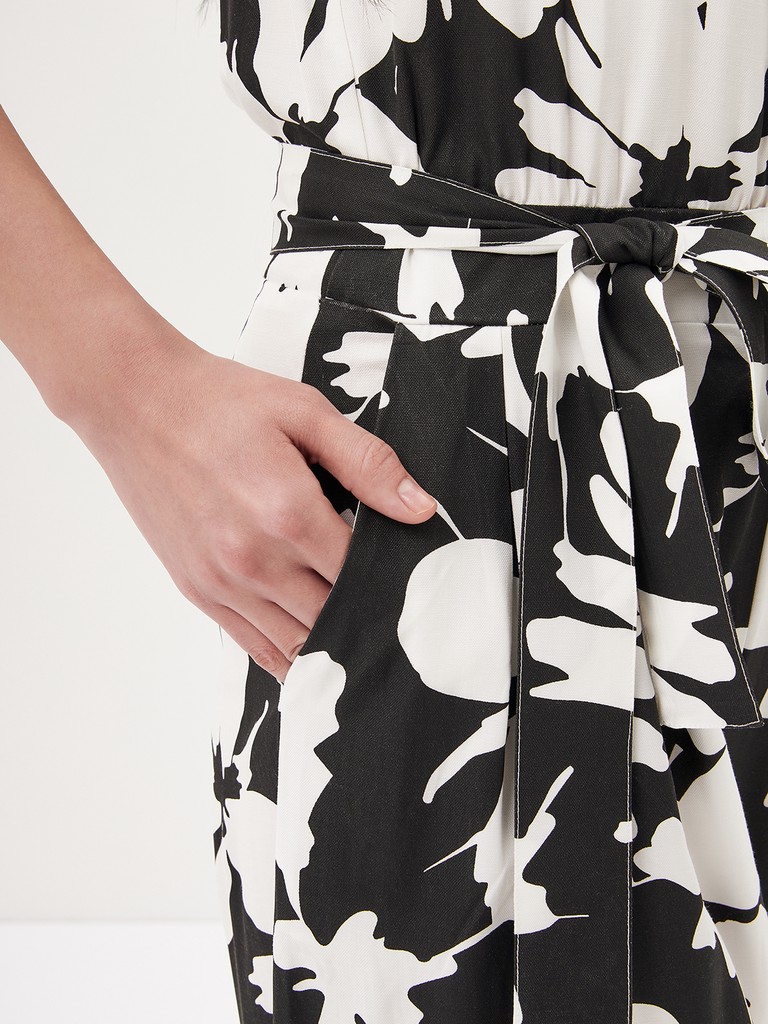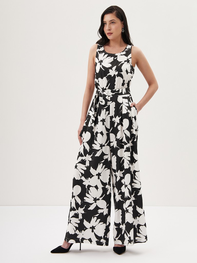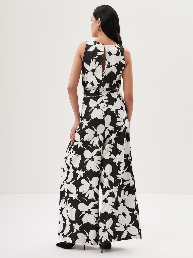 Эффектный комбинезон в черно-белой гамме с крупным цветочным принтом-выразительная модель для ярких и элегантных образов. Приталенный верх, акцент на талии и широкие брючины создают женственный и вытянутый силуэт, который смотрится легко и очень стильно. Контрасный принт делает модель заметной и придает образу особую динамику и характер.