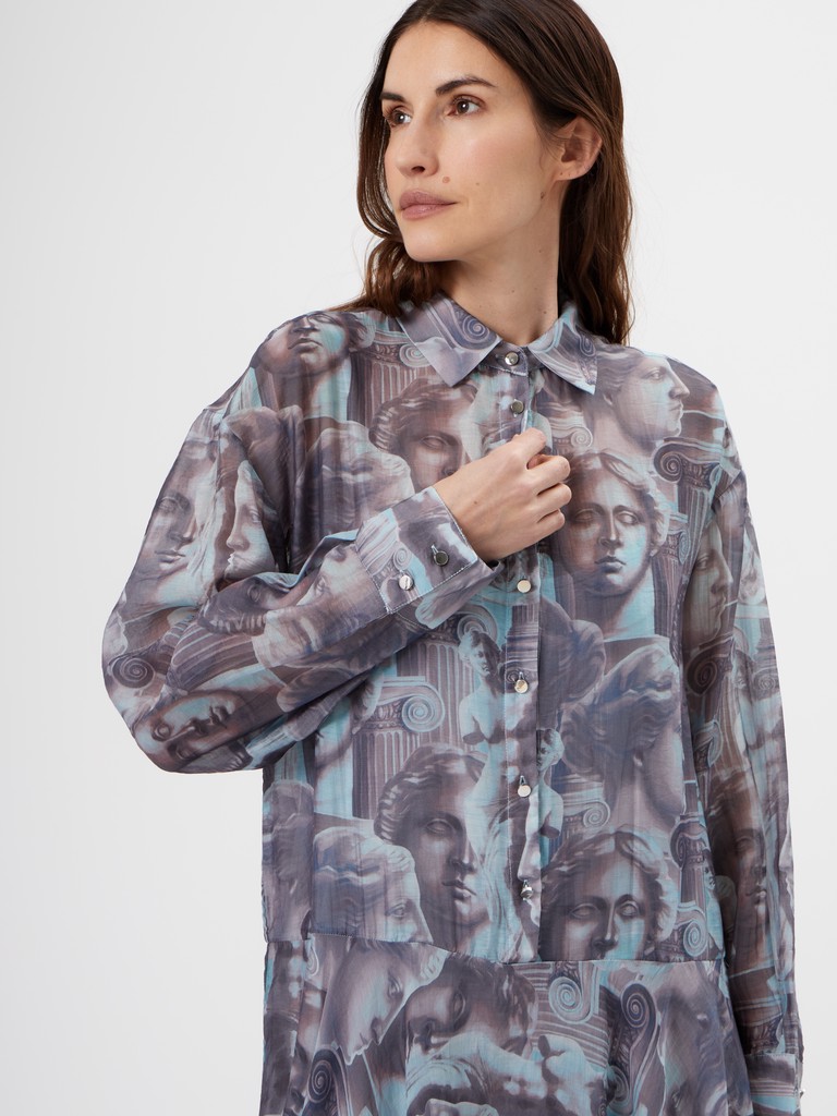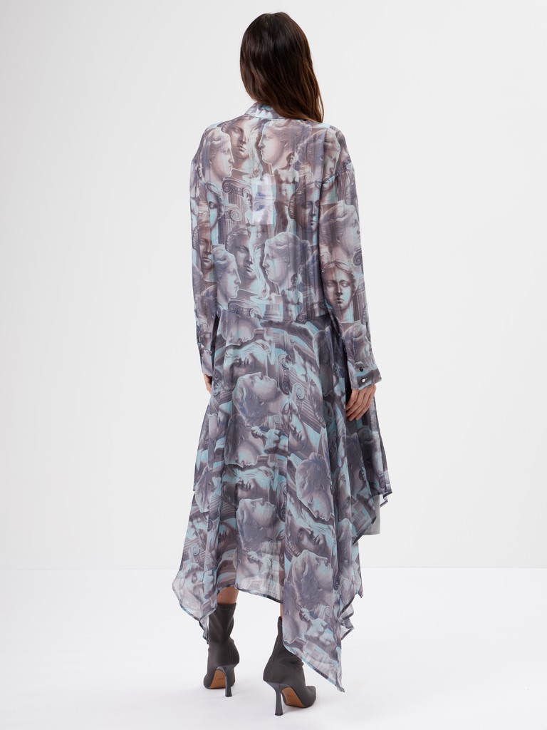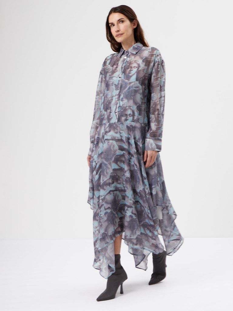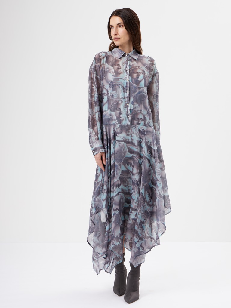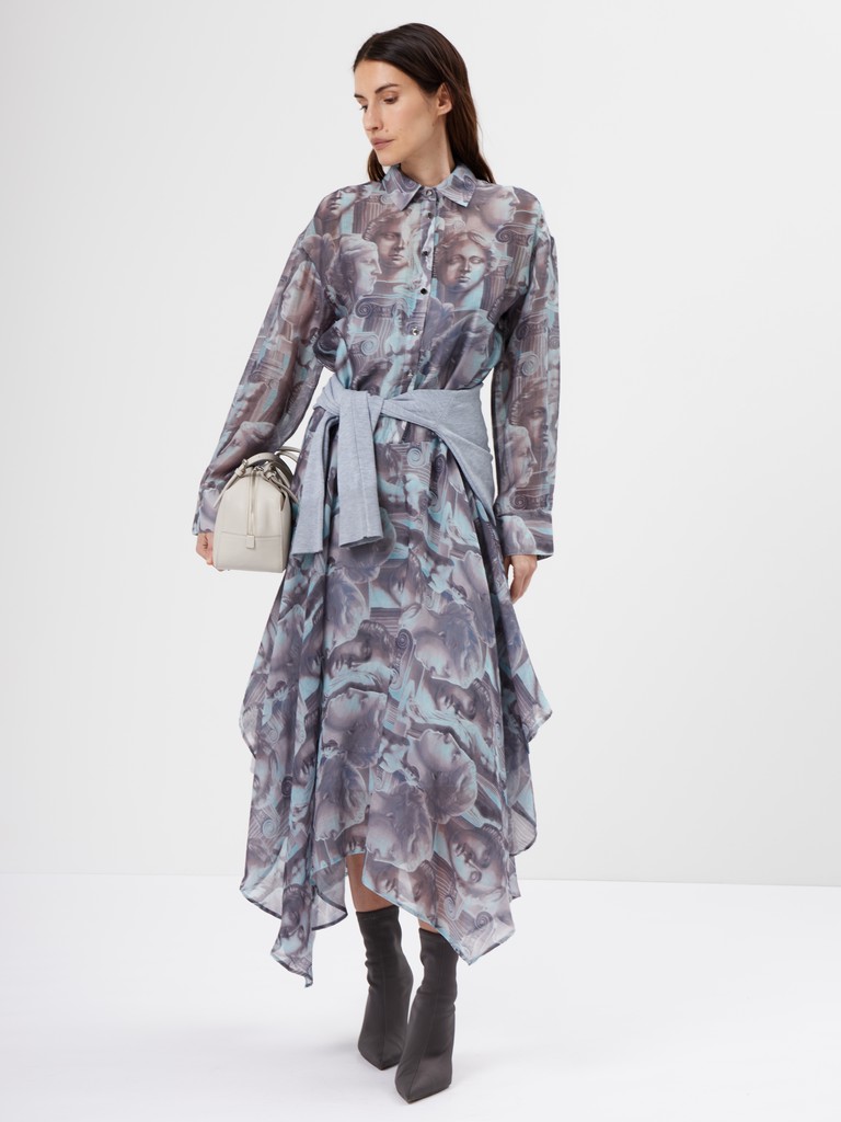Платье с художественным принтом — акцентное и при этом лёгкое в движении. Смесовая ткань на основе района и хлопка мягко струится, а подкладка обеспечивает комфорт и аккуратную посадку. Свободный силуэт с асимметричным низом добавляет динамики и делает образ более выразительным. Тот самый вариант, когда хочется выделиться — без перегруженности и лишних деталей.