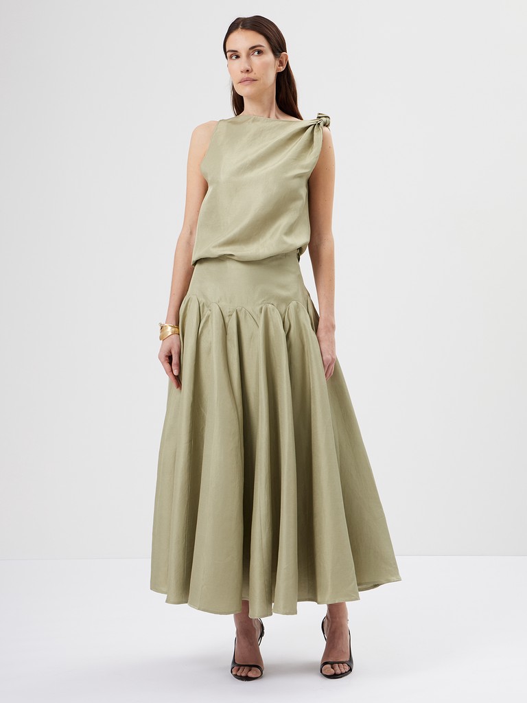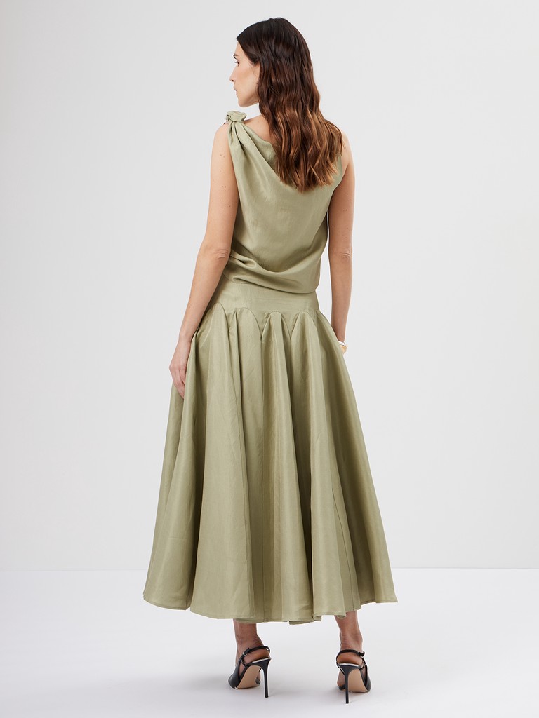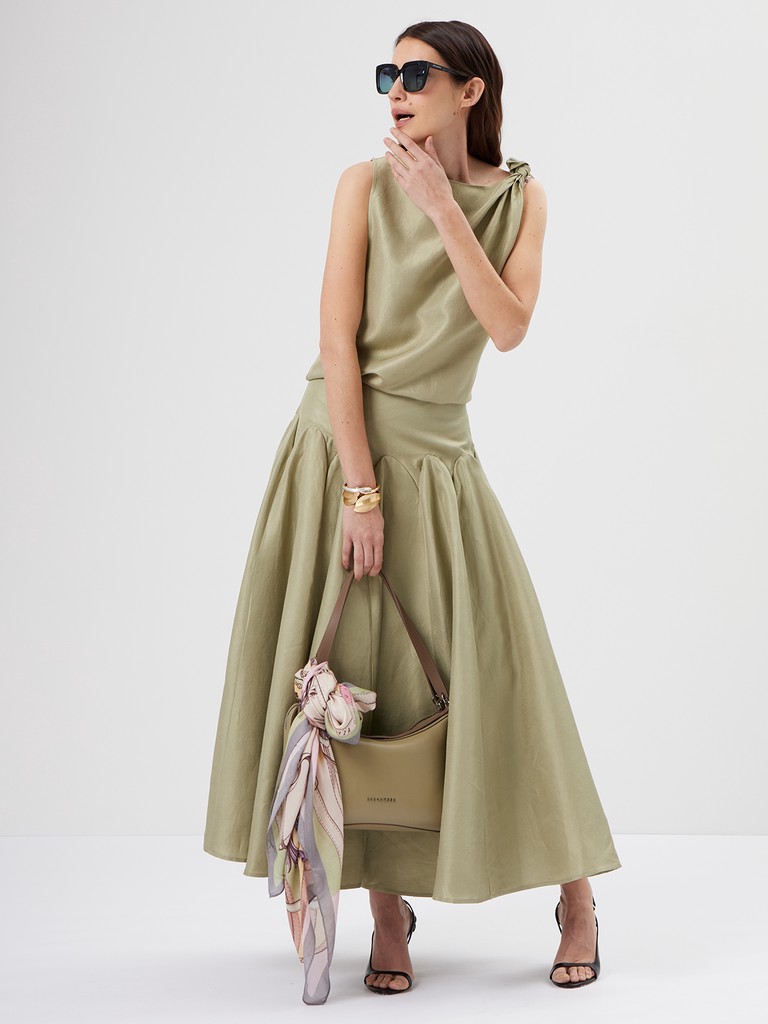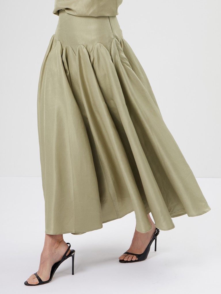 Юбка макси с крупными складками. Объемный силуэт формируется за счет глубоких складок, которые заложены от пояса и равномерно расходятся к низу. Материал — смесовая ткань на основе рами с добавлением льна, что дает структуру, легкость и естественную дышащую текстуру. Подкладка из 100% хлопка обеспечивает комфорт при носке и сохраняет форму изделия. Светлый фисташковый оттенок добавляет образу мягкости и свежести.