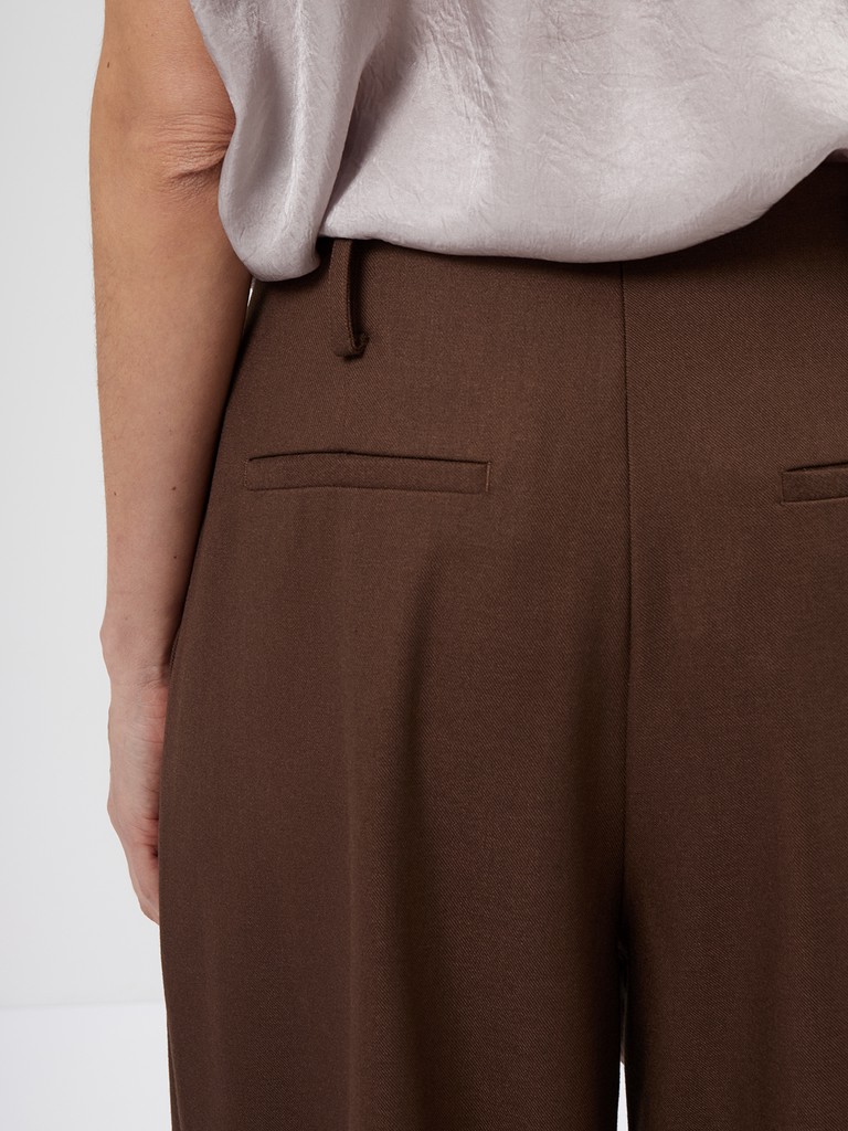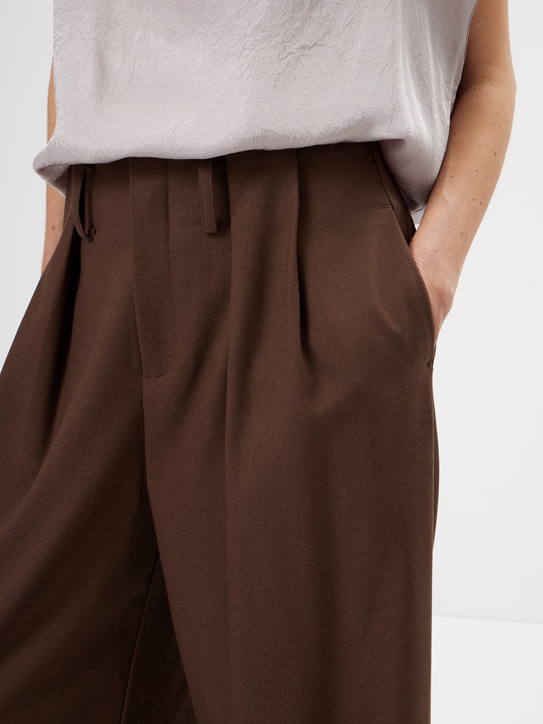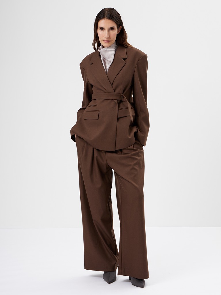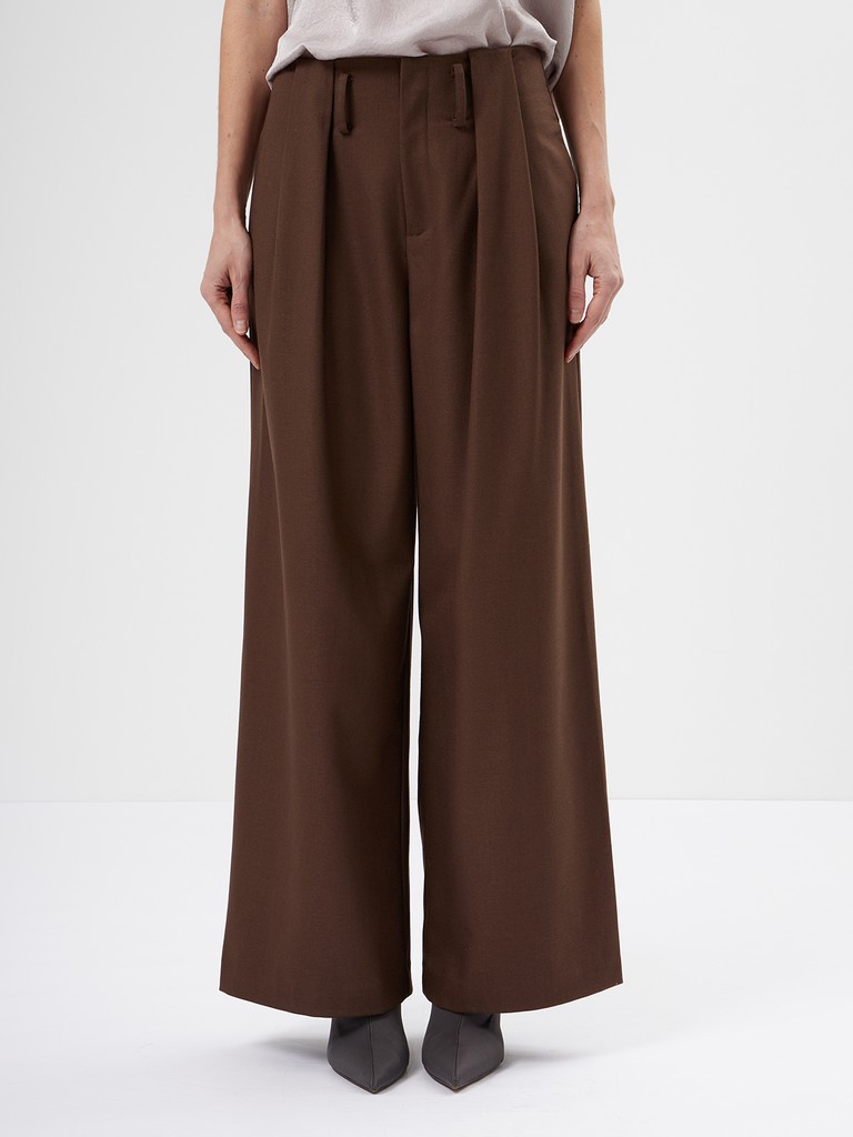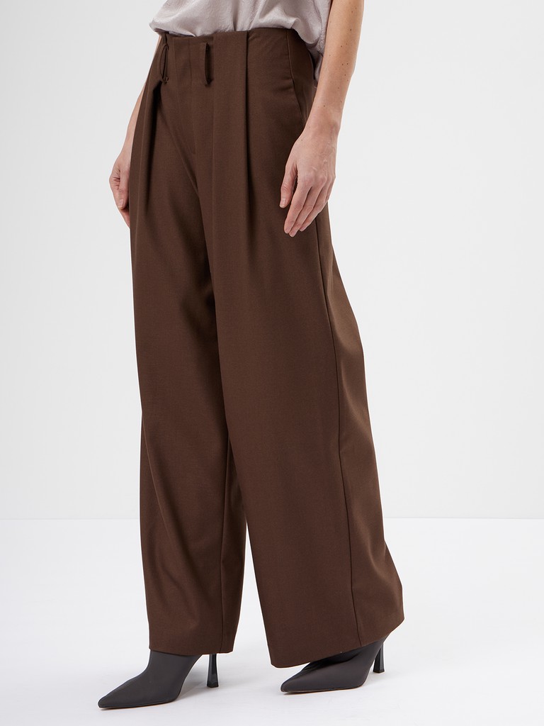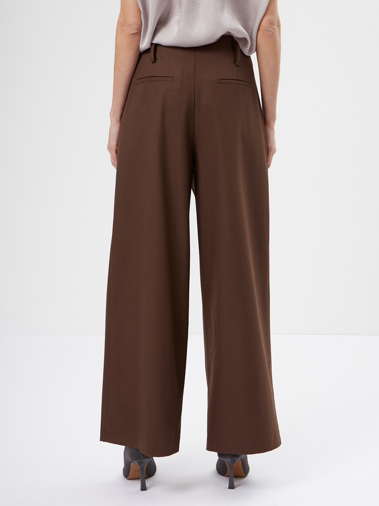 Широкие брюки палаццо — элегантная база для городского и делового гардероба. Высокая посадка и мягкие складки/защипы у пояса красиво подчёркивают талию и визуально вытягивают силуэт, а свободные прямые штанины дают эффект «длинных ног» и комфорт в движении. Плотная костюмная ткань держит форму.