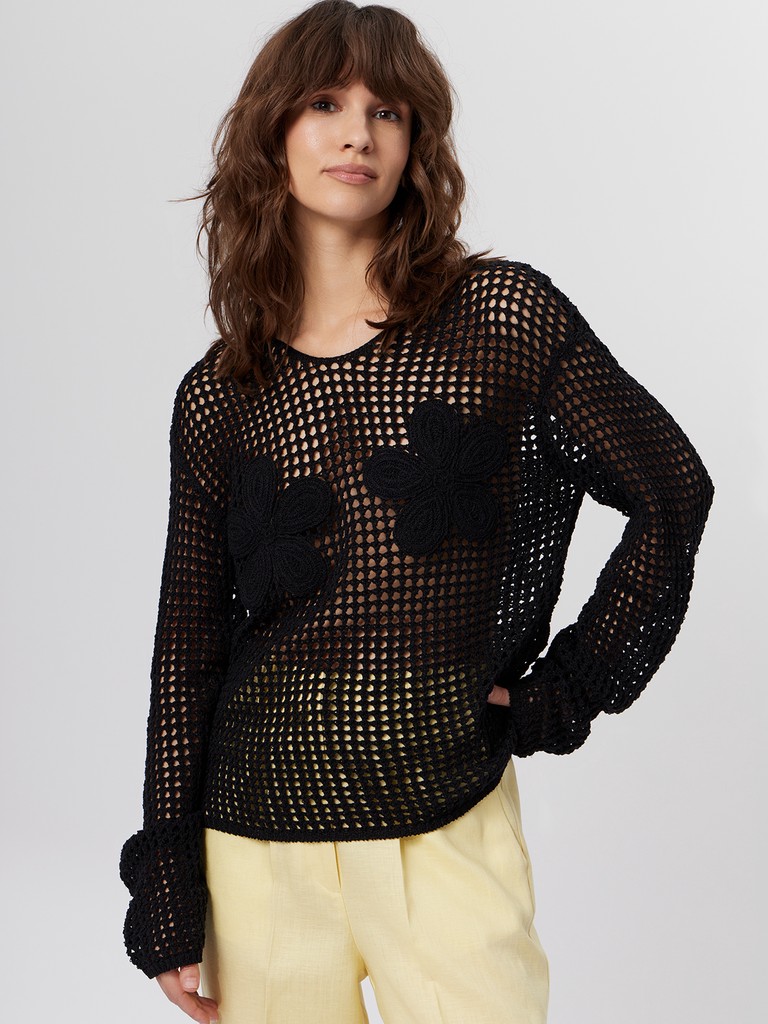 Полупрозрачный джемпер сетчатой вязки - выразительная модель для тех, кто ценит современную эстетику и легкость в образе. Черный цвет подчеркивает глубину фактуры, а воздушная вязка создает эффектныйбаланс между минимализмом и акцентностью.