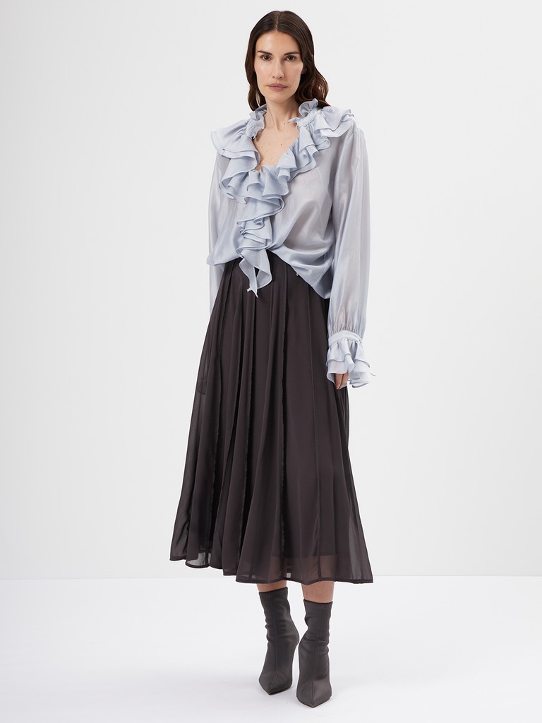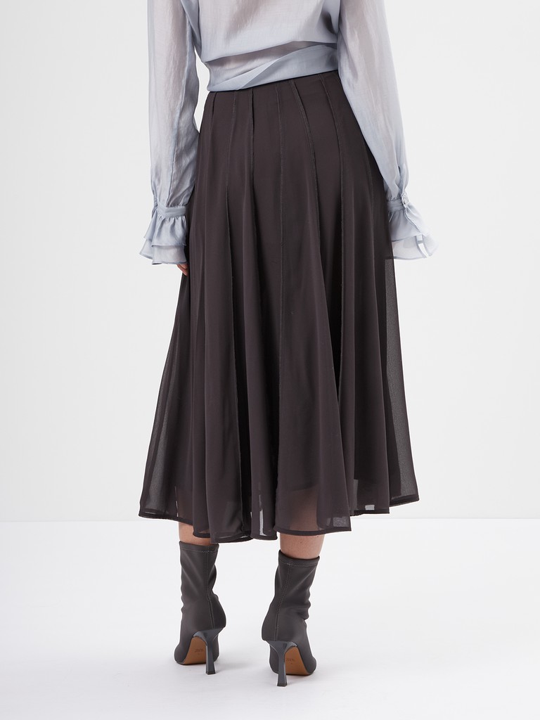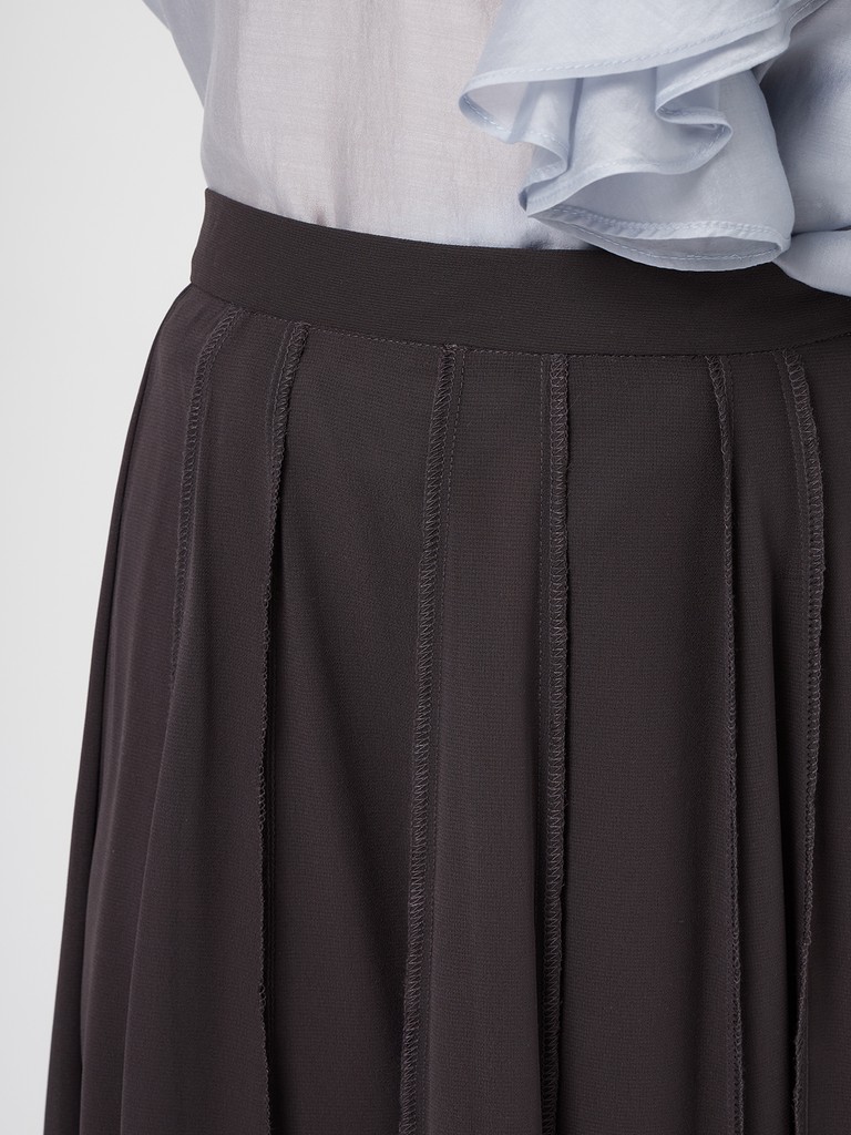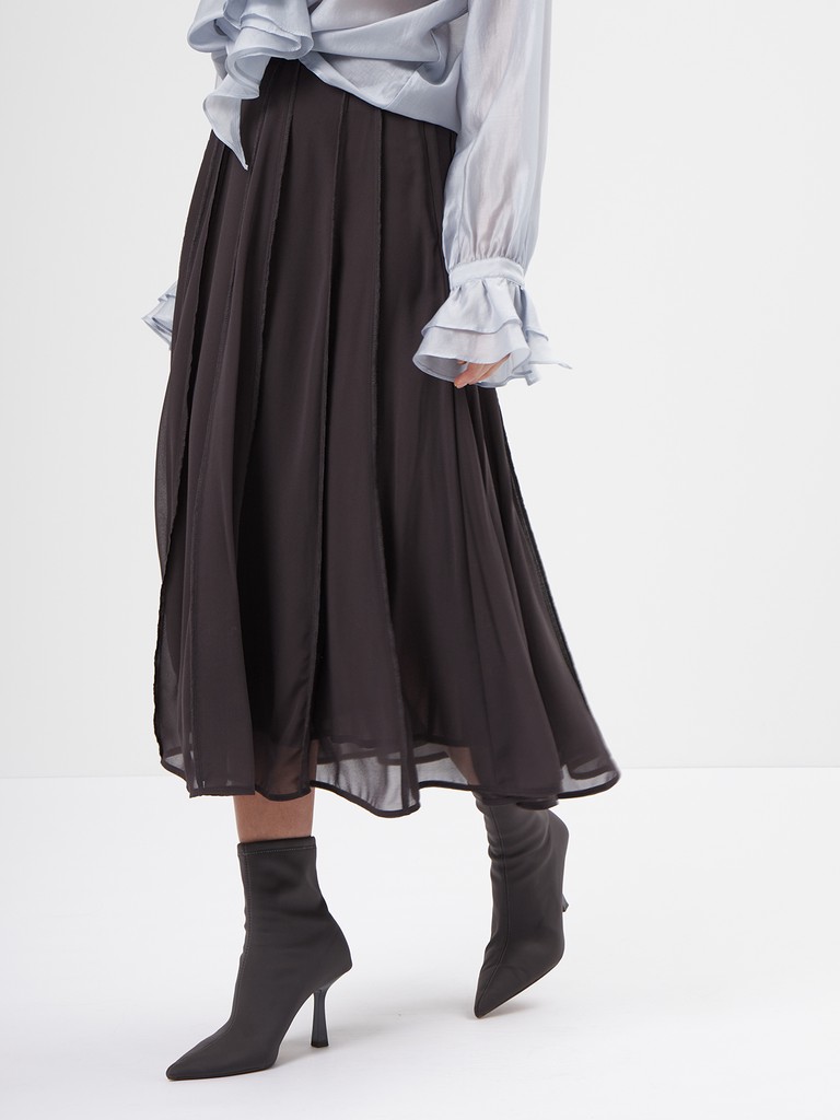 Двойная юбка миди с открытой конструкцией. Верхний слой из полиэстера создает вертикальную графику за счет множества зафиксированных складок. Подклад из 100% хлопка. Конструкция построена на эффекте вывернутой формы: швы и внутренние слои вынесены наружу, что дает нестандартный объем за счет наслоения, а не за счет формы.