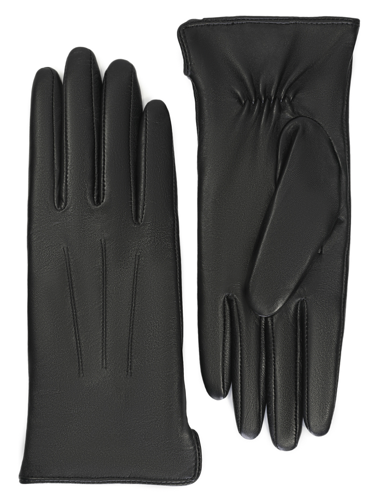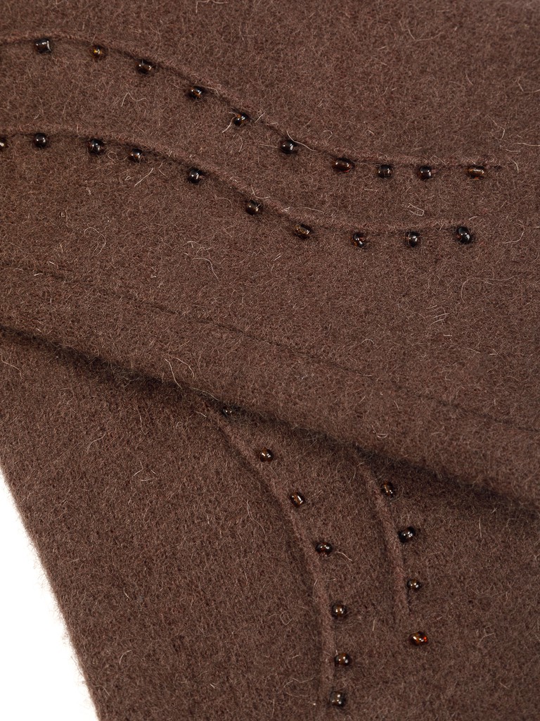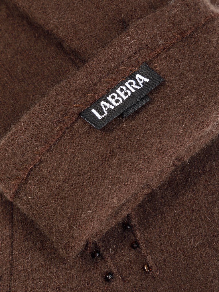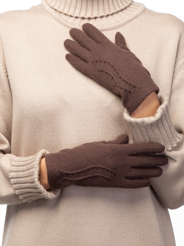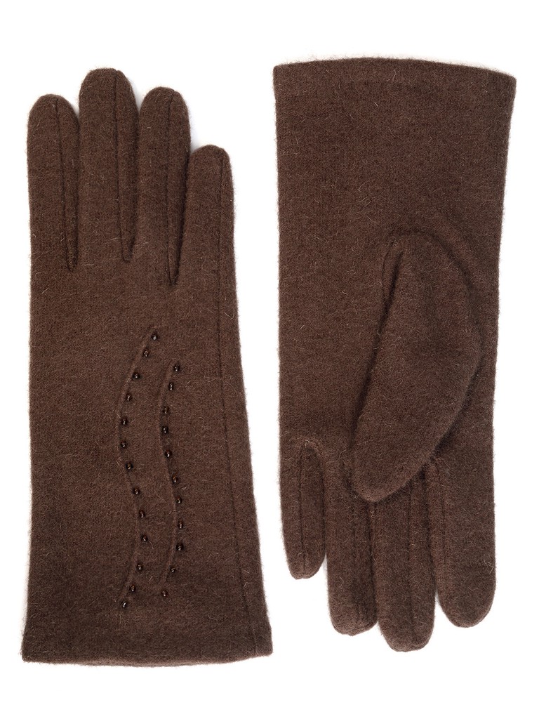 Перчатки торговой марки LABBRA производства Китай выполнены из трикотажной шерсти. Состав трикотажа: 80% шерсть, 20% нейлон. Без подкладки. На лицевой стороне перчатки декоративная отстрочка и бисер. Длина манжеты от нижней точки большого пальца до края перчатки - 5,5 см. Длина пальцев - средняя.