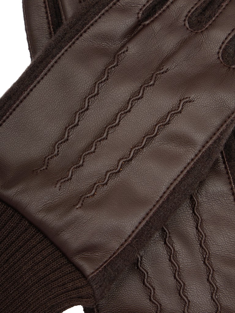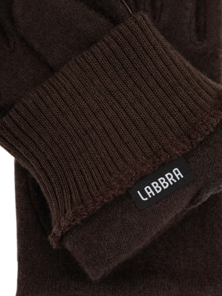 Перчатки торговой марки LABBRA производства Китай выполнены из трикотажной шерсти и эко кожи. Отделка - "три луча" на лицевой части. Состав трикотажа: 80% шерсть, 20% нейлон. Без подкладки. Длина манжеты от нижней точки большого пальца до края перчатки 7 см. Длина пальцев - средняя.