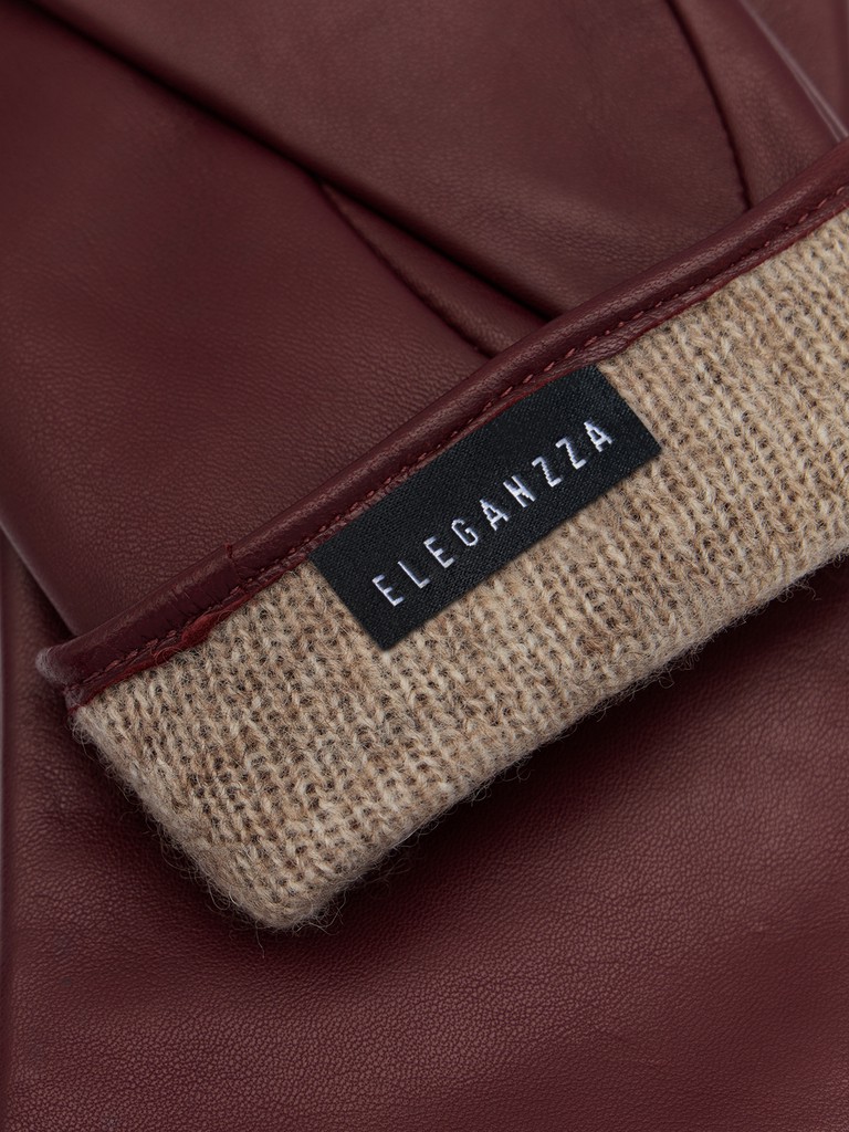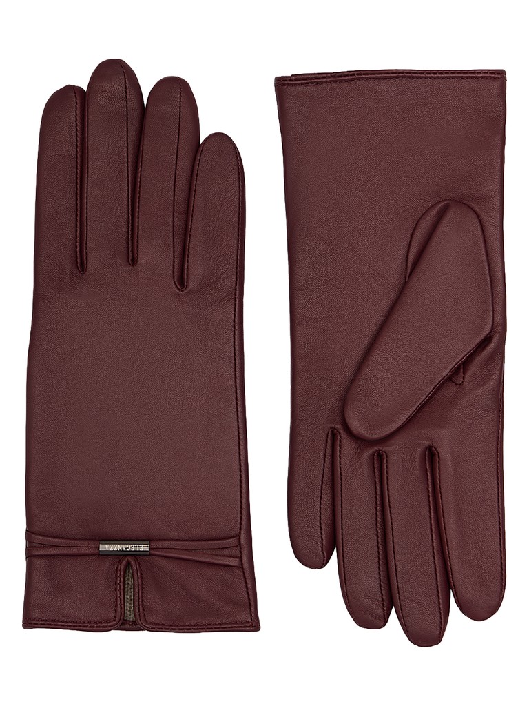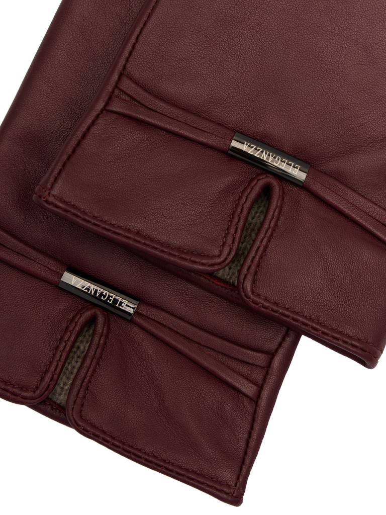 Перчатки торговой марки ELEGANZZA производства Китай выполнены из кожи ягнёнка цвета темного ягодного джема. Подкладка: 100% шерсть. Декоративные элементы - фирменная фурнитура на узких кожаных ремнях. Нижний край перчатки и разрез на лицевой стороне окантованы. Длина манжеты от нижней точки большого пальца до края перчаток - 6 см.