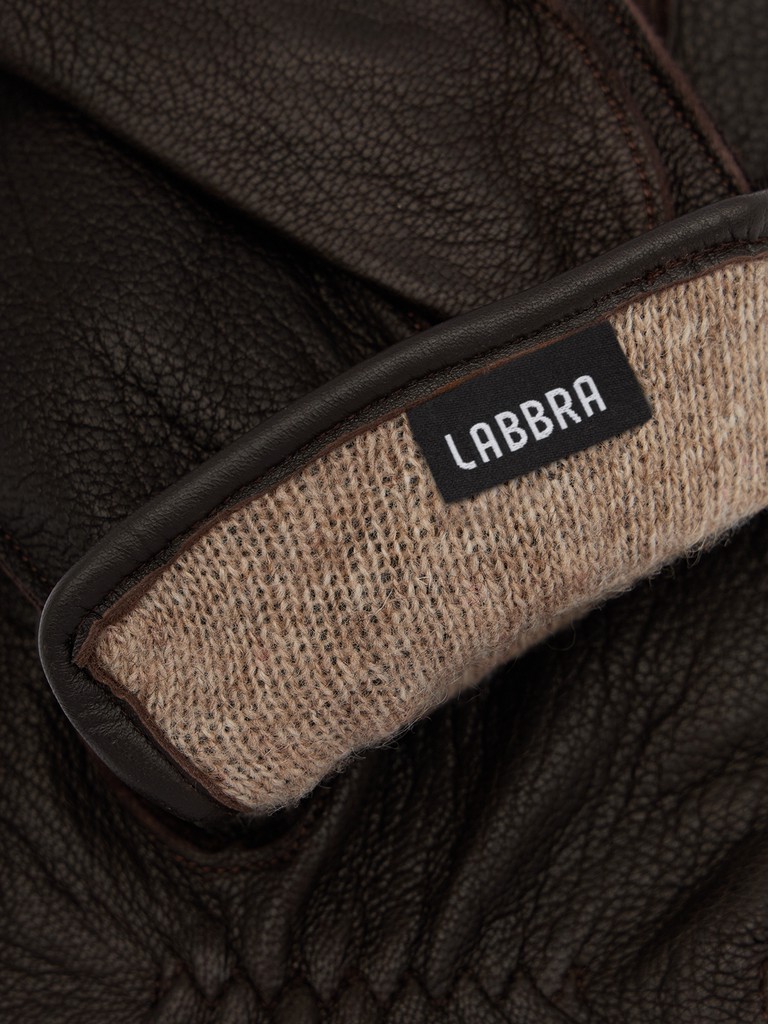 Перчатки торговой марки LABBRA производства Китай изготовлены из натуральной кожи ягненка с тиснением под оленя. Подкладка: 70%шерсть, 30% акрил. Боковой разрез на манжете и фурнитура с символикой бренда. Длина манжеты от нижней точки большого пальца до края перчаток составляет 5 см. Длина пальцев - средняя.