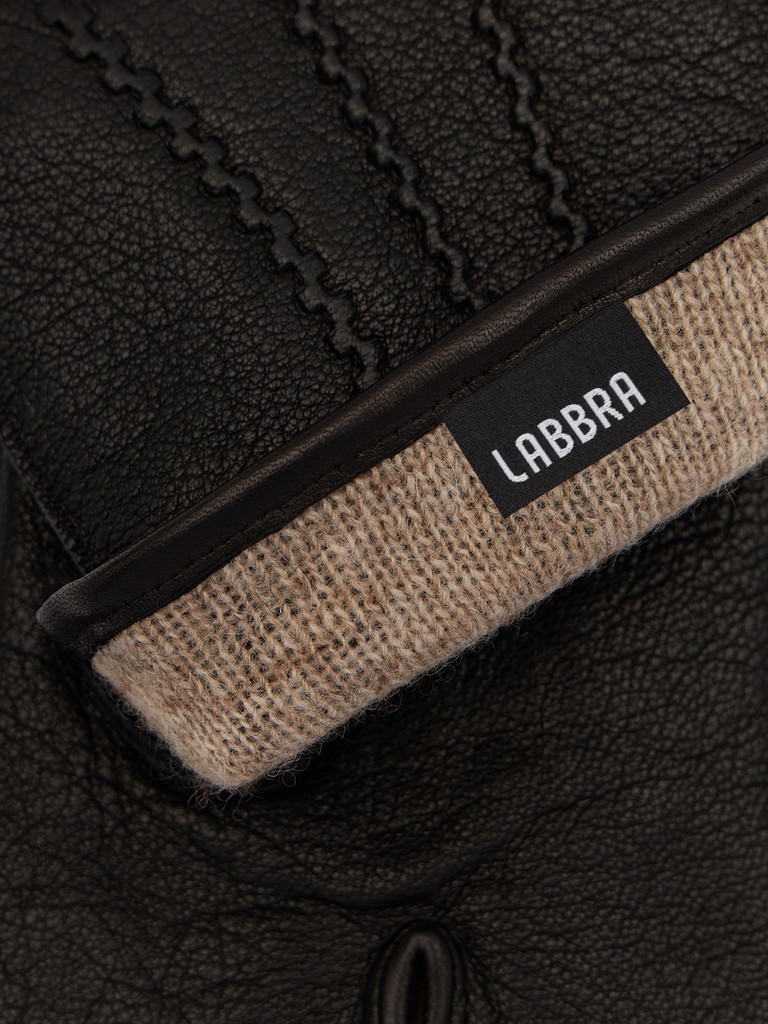 Перчатки торговой марки LABBRA производства Китай изготовлены из натуральной кожи ягненка с тиснением под оленя. Подкладка: 70%шерсть, 30% акрил. Отделка - "три луча" на лицевой части. Длина манжеты от нижней точки большого пальца до края перчаток составляет 5 см. Длина пальцев - средняя.