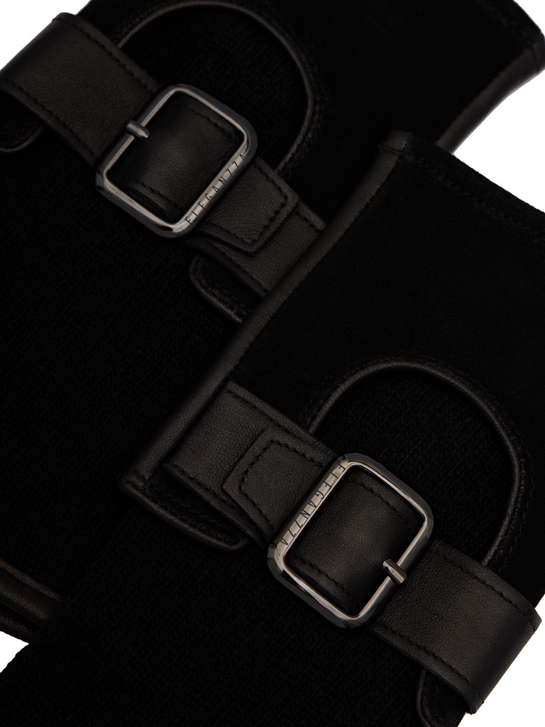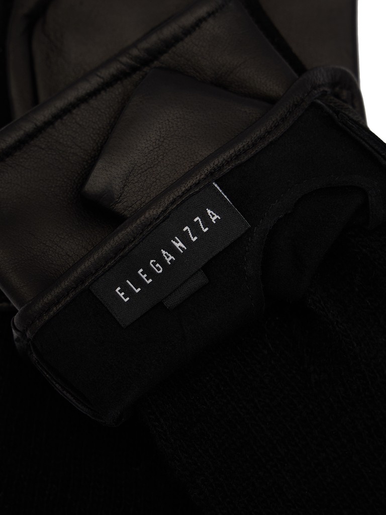 Митенки торговой марки ELEGANZZA атуральной кожи ягнёнка и натурального велюра. Подкладка и манжет - 85% шерсть, 15% кашемир. Митенка украшена пряжкой с символикой бренда. Длина манжеты от нижней точки большого пальца до края перчаток - 1,5 см.